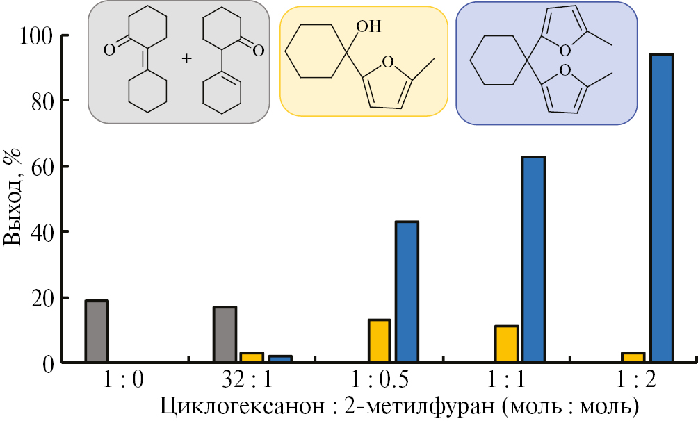 Рис. 2. Конденсация циклогексанона с 2-метилфураном при разных соотношениях реагентов. Условия: 20 мг PAF-30-SO3H, 0.4 мл циклогексанона, 0–0.7 мл 2-метилфурана, 60°C, 1 ч, 1 МПа N2. Выход продуктов рассчитан на основе конверсии циклогексанона.