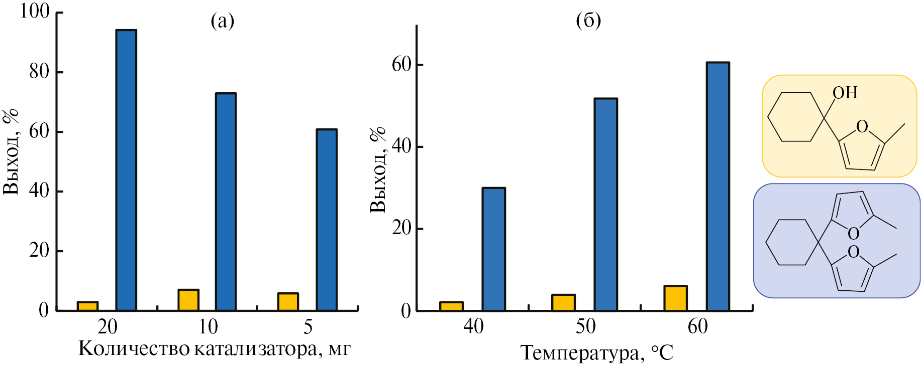 Рис. 3. Зависимость выхода продуктов конденсации циклогексанона и 2-метилфурана от количества катализатора (а) и температуры процесса (б). Условия: 1) 0.4 мл циклогексанона, 0.7 мл 2-метилфурана, 60°C, 1 ч, 1 МПа N2; 2) 5 мг PAF-30-SO3H, 0.4 мл циклогексанона, 0.7 мл 2-метилфурана, 1 ч, 1 МПа N2.