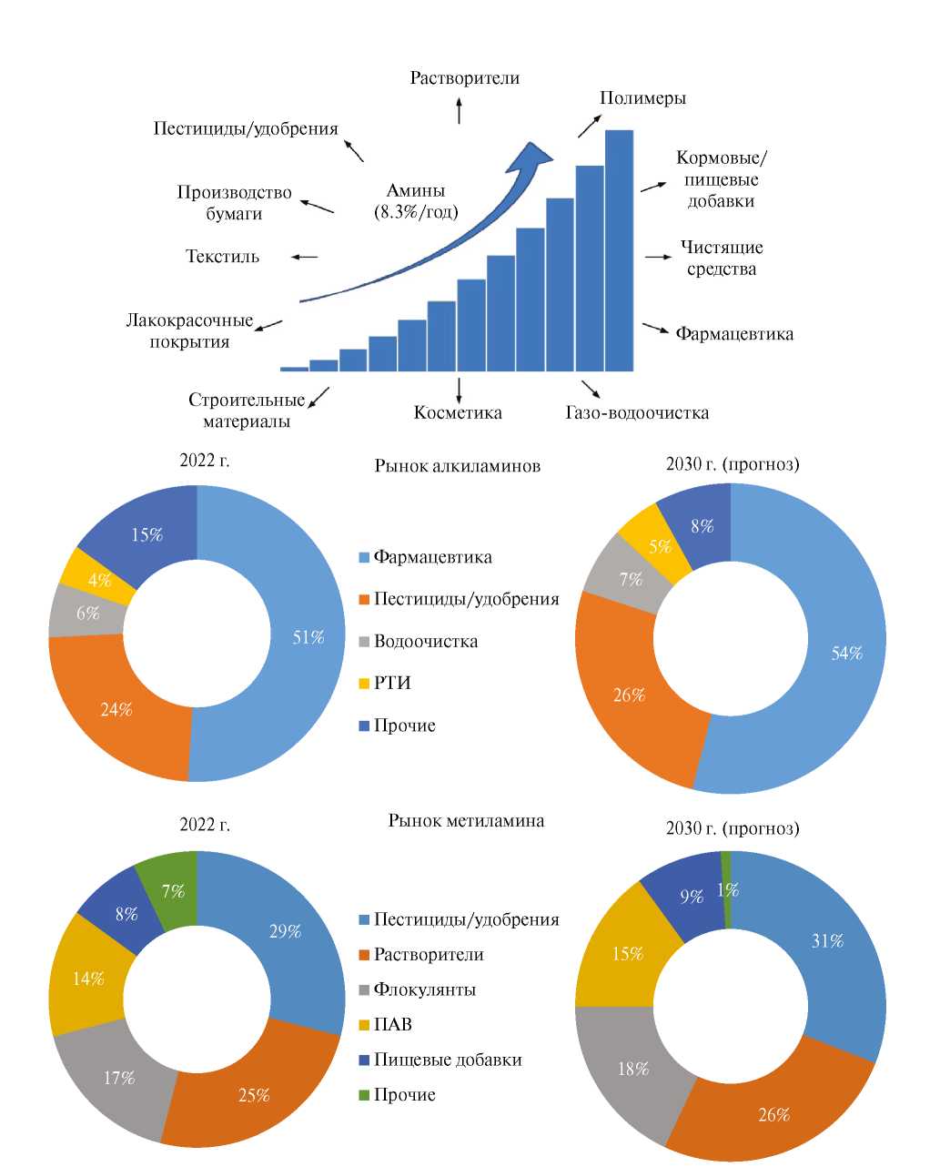 Амины имеют довольно широкий спектр применения, а их рынок обладает тенденцией к росту порядка 8.3% ежегодно [4]. Преимущественно они используются в качестве промежуточных соединений в производстве функциональных продуктов, таких как добавки к маслам и топливам [5, 6], полиамидные смолы [7, 8], адгезионные присадки и эмульгаторы для битума [9–13], смолы и добавки для целлюлозно-бумажной промышленности [14–16], отвердители эпоксидных смол [17–19], активаторы отбеливания [20, 21], хелаты и хелатирующие агенты [22, 23], в переработке металлических руд [24], в качестве поверхностно-активных веществ и эмульгаторов, смягчителей тканей [25–27], фунгицидов [28, 29]. Помимо этого, амины находят применение в производстве красителей [30, 31], пестицидов [32, 33], полимеров (в том числе полиамидов и полиуретанов) [34, 35], ингибиторов коррозии [36, 37], флотореагентов [38, 39], абсорбентов [40–42], лекарственных средств [43, 44], ускорителей вулканизации и антиоксидантов [45, 46]. Среди аминов алкиламины находят широкое применение в различных высокотехнологичных отраслях промышленности и специализированных областях, таких как производство резины, красок и покрытий, агрохимия, очистка воды, фармацевтика и многие другие. Благодаря универсальности и многофункциональности алкиламинов спрос на них постоянно возрастает: производственная мощность по алкиламинам в Европе, Северной Америке, Азии, Южной Америке, Африке и на Среднем Востоке в 2022 г. суммарно составила 2000–2500 тыс. т и продолжает расти [47, 48]. Потребность в метиламине в 2022 г. при этом составила 650 тыс. т, причем тенденция к увеличению спроса оценивается в 4.21% ежегодно [49]. Доля рынка алкиламинов в целом и метиламина в частности по конечным потребителям по состоянию на 2022 г. и его прогноз на 2032 г. представлена на рис. 1 [4, 47].