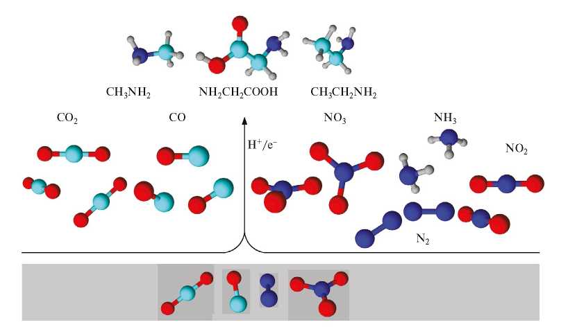 Образование аминов в ходе гетерогенного электрокатализа происходит путем образования C–N-связей в ходе совместного восстановления CO2 или CO и NO3–, NO2–, N2 или NH3 [51]. В этих реакциях промежуточные продукты, образующиеся при электрохимическом восстановлении оксидов углерода, взаимодействуют с азотистыми соединениями, которые либо соадсорбированы на электроде, либо находятся в растворе (рис. 3).