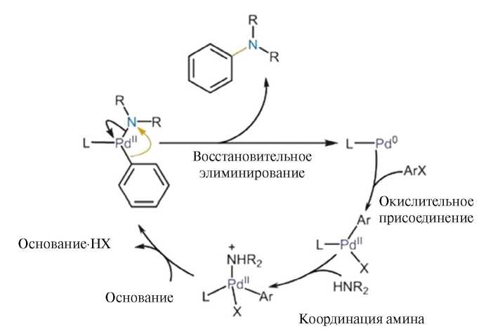 Рис. 7. Пример пути образования C–N-связей в молекулярном катализе по кросс-сочетанию Бухвальда–Хартвига (адаптировано из [51]).