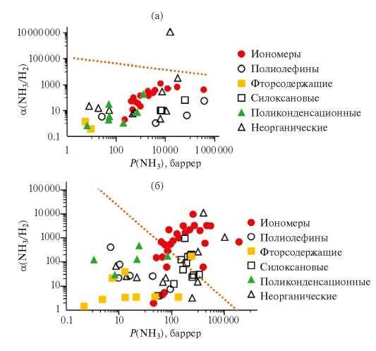 Аммиак-селективные мембранные материалы имеют различную природу, поэтому имеет смысл условно разделить эти материалы на группы и рассмотреть каждую группу отдельно. Авторами было принято решение разделить материалы литературных данных на следующие группы: иономерные материалы, полиолефины, поликонденсационные материалы, фторсодержащие полимеры, силоксановые полимеры, неорганические материалы. Отдельно будет уделено внимание гибридным мембранным материалам (Mixed Matrix Membranes). На рис. 1 представлены диаграммы “коэффициент проницаемости–селективность” (диаграммы Робсона) для пар NH3–H2 (а) и NH3–N2 (б). В мембранной технологии для обозначения коэффициентов проницаемости газов (обозначается как P — от термина permeability coefficient) общепринятой единицей измерения является баррер (1 баррер = 10–10 см3 (н. у.) см см–2 с–1 (см рт. ст.)–1), названной так в честь английского исследователя диффузии в полимерах Р. М. Баррера. Идеальная селективность по паре газов представляет собой отношение их коэффициентов проницаемости и обозначается α. На рис. 2 и 3 представлены также соответственно парные корреляции коэффициентов проницаемости аммиака и водорода, аммиака и азота для различных типов мембранных материалов.