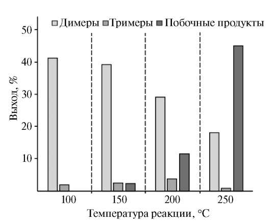 Рис. 2. Состав продуктов конденсации циклогексанона на катализаторе PAF-30-SO3H(5%) при разных температурах. Условия реакции: 10 мг PAF-30-SO3H (5%); 0.4 мл циклогексанона; 1 ч; 10 атм. N2.