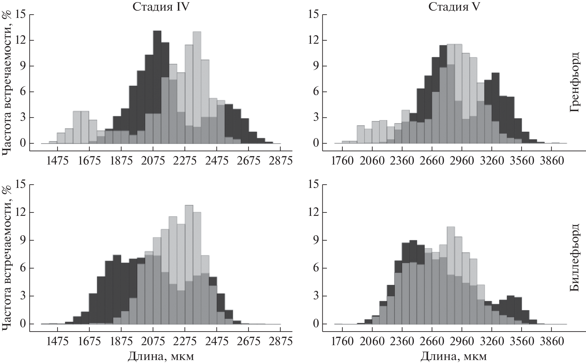 Based on the materials obtained in two fjords of West Spitsbergen Island, analysis of seasonal and spatial variability in the size distribution of Calanus sp. has been made. Statistically significant differences in the size structure of the fourth and fifth copepodite stages of the summer and late autumn period have been revealed. Populations of Grønfjorden and Billefjorden show spatial variability determined by local variations of the natural environmental factors. The discussed reasons of the observed seasonal variability are selective grazing of the largest specimens by predators of higher trophic levels, individual body size changes during accumulation or consumption of oil storage, as well as presence of two generations with different size parameters in the water column.