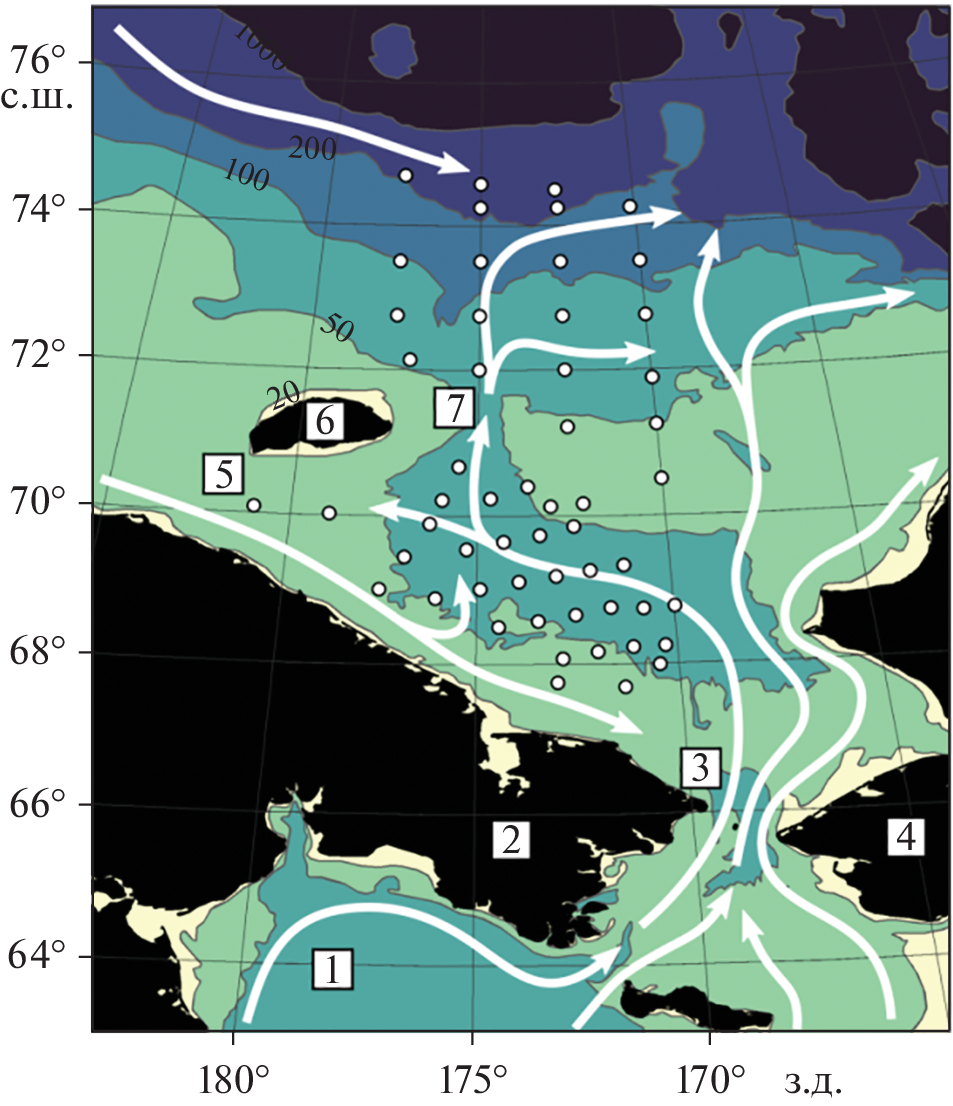 The distribution of water masses in August 2019 in the Chukchi Sea, and their hydrochemical features are i-nvestigated using shipboard data from the transarctic expedition onboard the R/V Professor Levanidov. The work was carried out in the southern shallow part of the sea and in the northern part of the sea outside the 70-meter isobath. Six main water masses were identified: Alaskan and Anadyr Coastal Water (ACW), Siberian Coastal Water (SCW), Melt Water (MW), Summer Bering Sea Water (BSW), Remnant Pacific Winter Water (RWW) and Atlantic Water (AW). Their features are described and analyzed. It was revealed that the water masses of the Chukchi Sea are characterized by a high spatial variability of hydrochemical parameters, especially the BSW, RWW and AW. In the southern part of the Chukchi Sea the presence of very high values of ammonium nitrogen in the bottom layer was noted (up to 12.6 µM). In august 2019, transformed AW, typically residing below 150 m, were observed at a depth of 117–137 meters, characterized by salinity values from 34.2 to 35.7, high content of mineral silicon (93–97 µM), low elevated values of apparent oxygen utilization (240–270 µM), and unusually low N* (a measure of the fixed nitrogen excess relative to phosphorus) values (down to −24.0 µM). At the same time, the AW observed at depths below 140 m did not have such hydrochemical features.