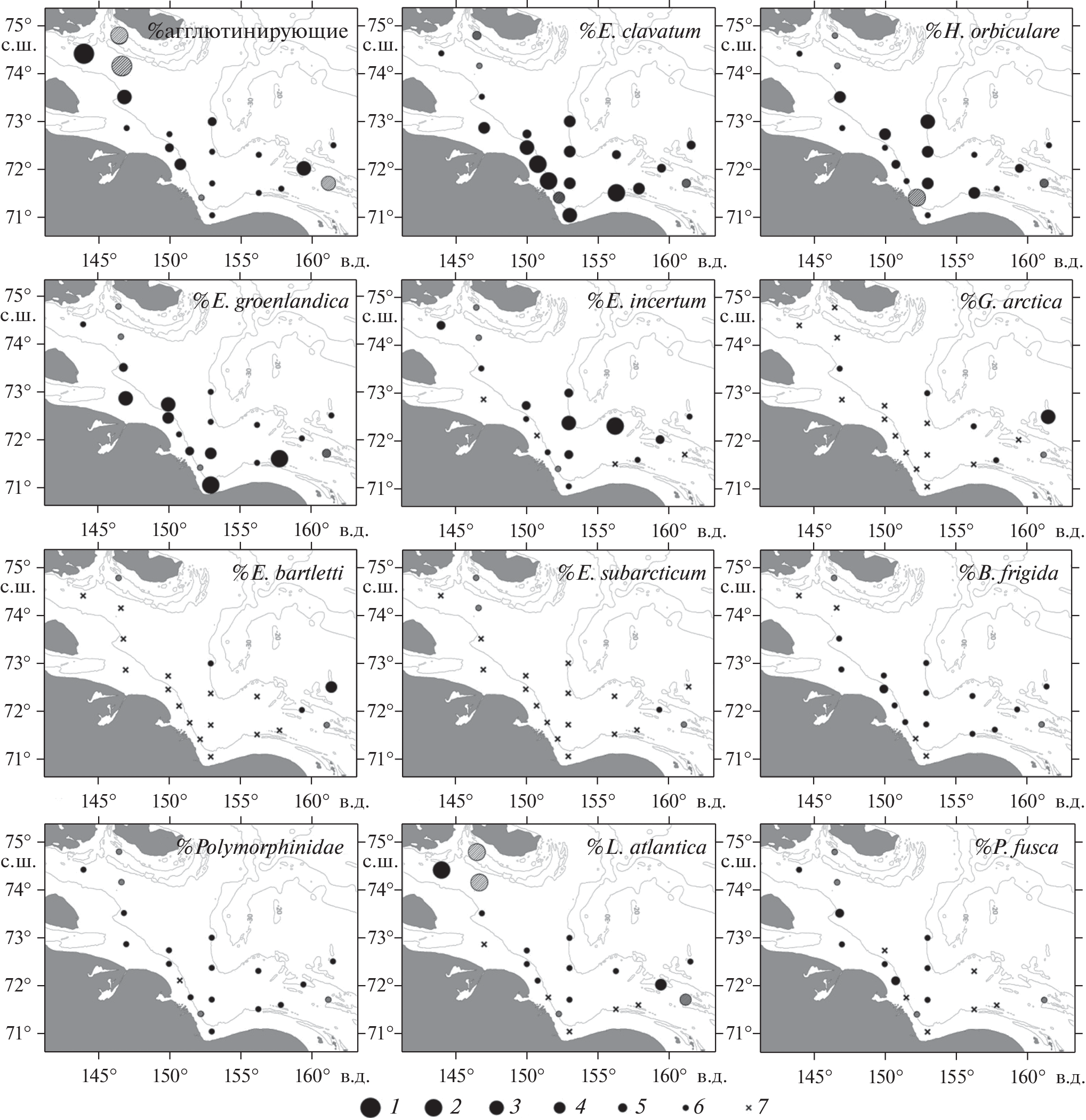 Benthic foraminiferal assemblages were studied in twenty surface sediment samples collected in the western part of the East Siberian Sea in the framework of the expedition of the R/V “Ivan Kireev” in 2004. Rose Bengal treatment allows us to separate “living” and “dead” individuals. Taxonomic analyses reveal that “living” calcareous foraminifers dominate in the study region with the exception of the New Siberian Islands area and area to the northeast from the Indigirka river mouth where agglutinated tests constitute up to a half of the assemblage. Little amount of dead individuals points to a rapid dissolution of calcareous tests immediately after death of organism. Taxonomic composition of the studied assemblages is similar to river-proximal benthic foraminiferal assemblage previously determined for the Kara Sea. In the East Siberian Sea, the most commonly occurred species are E-lphidium clavatum, Elphidiella groenlandica, Haynesina orbiculare, E. incertum и Lagenammina atlantica. Less abundant species are Gordiospira arctica, Buccella frigida, E. bartletti, Reophax curtus, R. scorpiurus and polymorphinids. As a result of statistical treatment, four areas with specific BF assemblages have been distinguished: area of the Indigirka River mouth, zone affected by Siberian Coastal Current, area located to the north of the Siberian Coastal Current and zone situated close to the New Siberian Island archipelago together with an area located to the northeast from the Indigirka river mouth. Such a distribution of BF assemblages in the study area seems to be related to the distance of the river discharge area, type of sediments and fresh organic matter content.