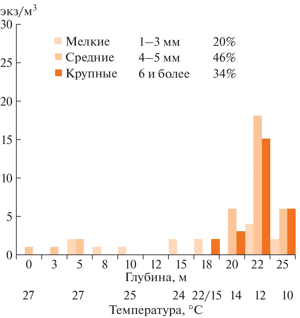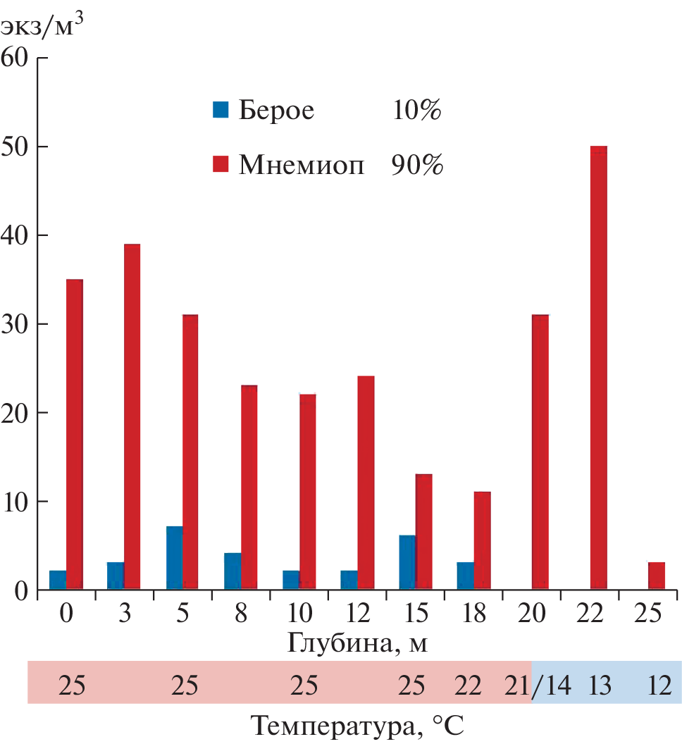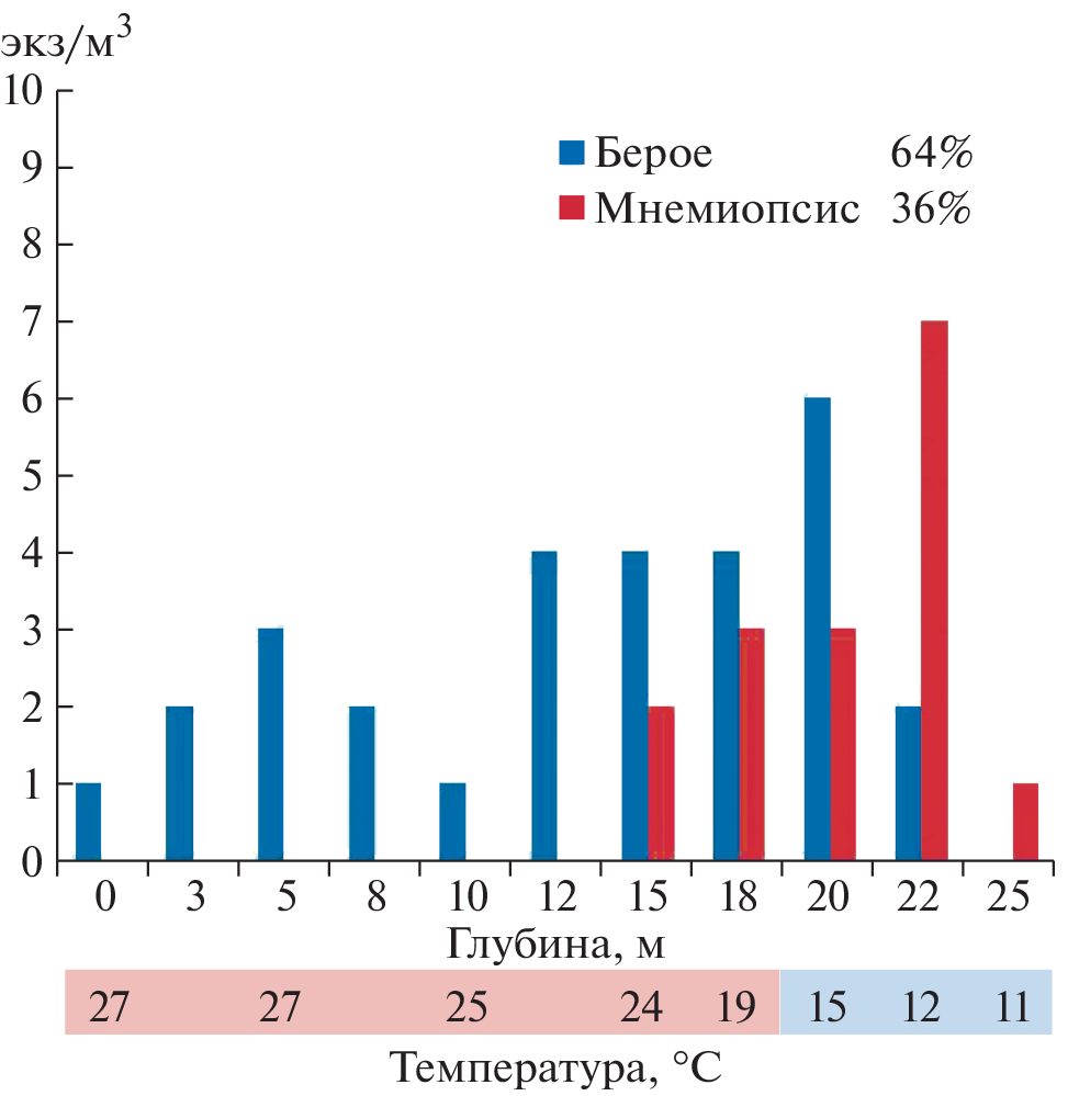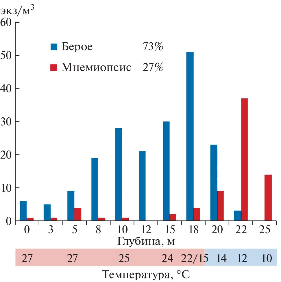 The latitudinal distribution of the ctenophores Mnemiopsis leidyi A. Agassiz, 1865 and Beroe ovata Bruguière, 1789 in the Russian sector of the Caspian Sea has different borders of their ranges. Studies on the occurrence of ctenophores in the water column have demonstrated that each species has a characteristic temperature limit of its vertical distribution. Investigations into interactions between ctenophores showed a considerable abundance suppression of M. leidyi (particularly of smaller individuals) by B. ovata.