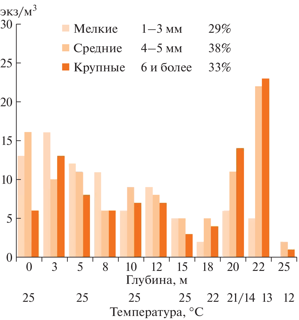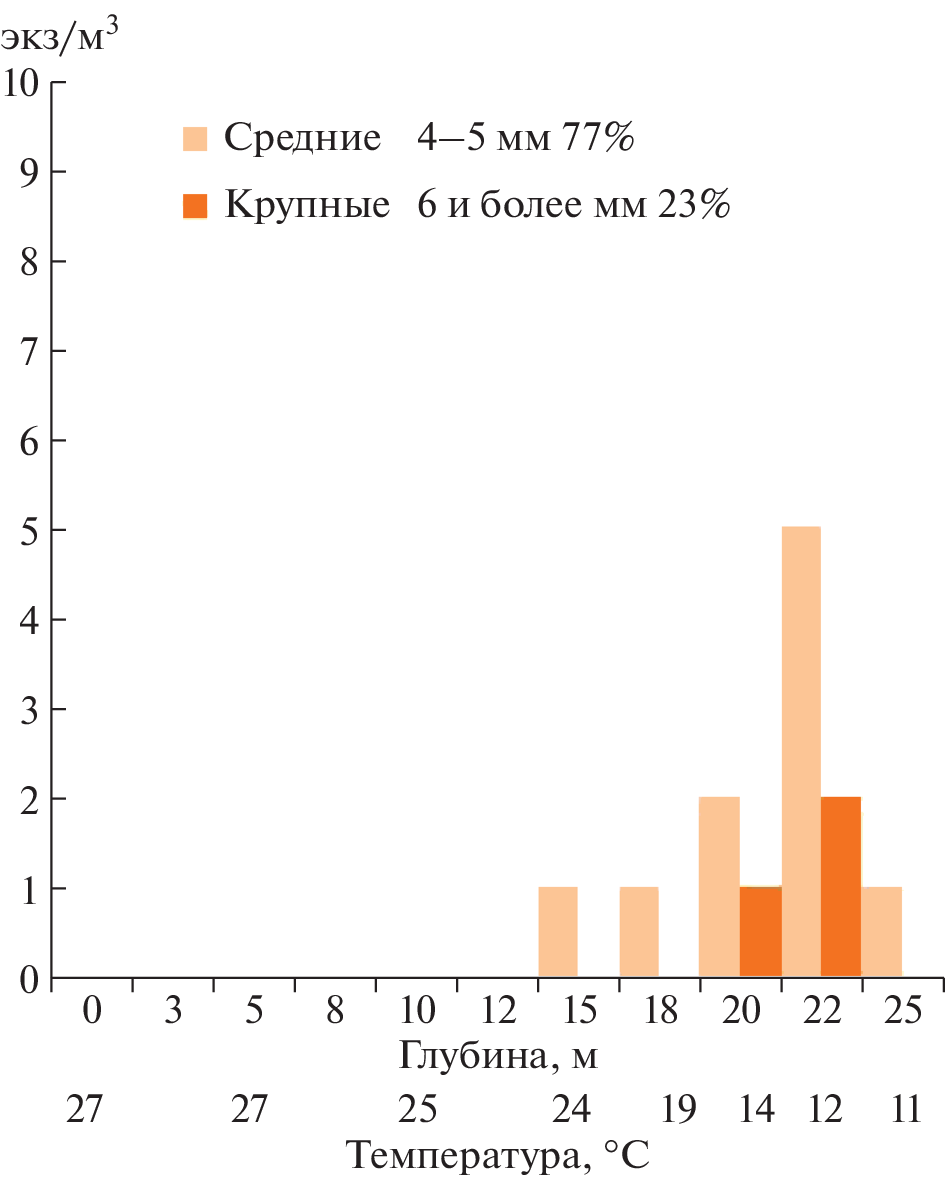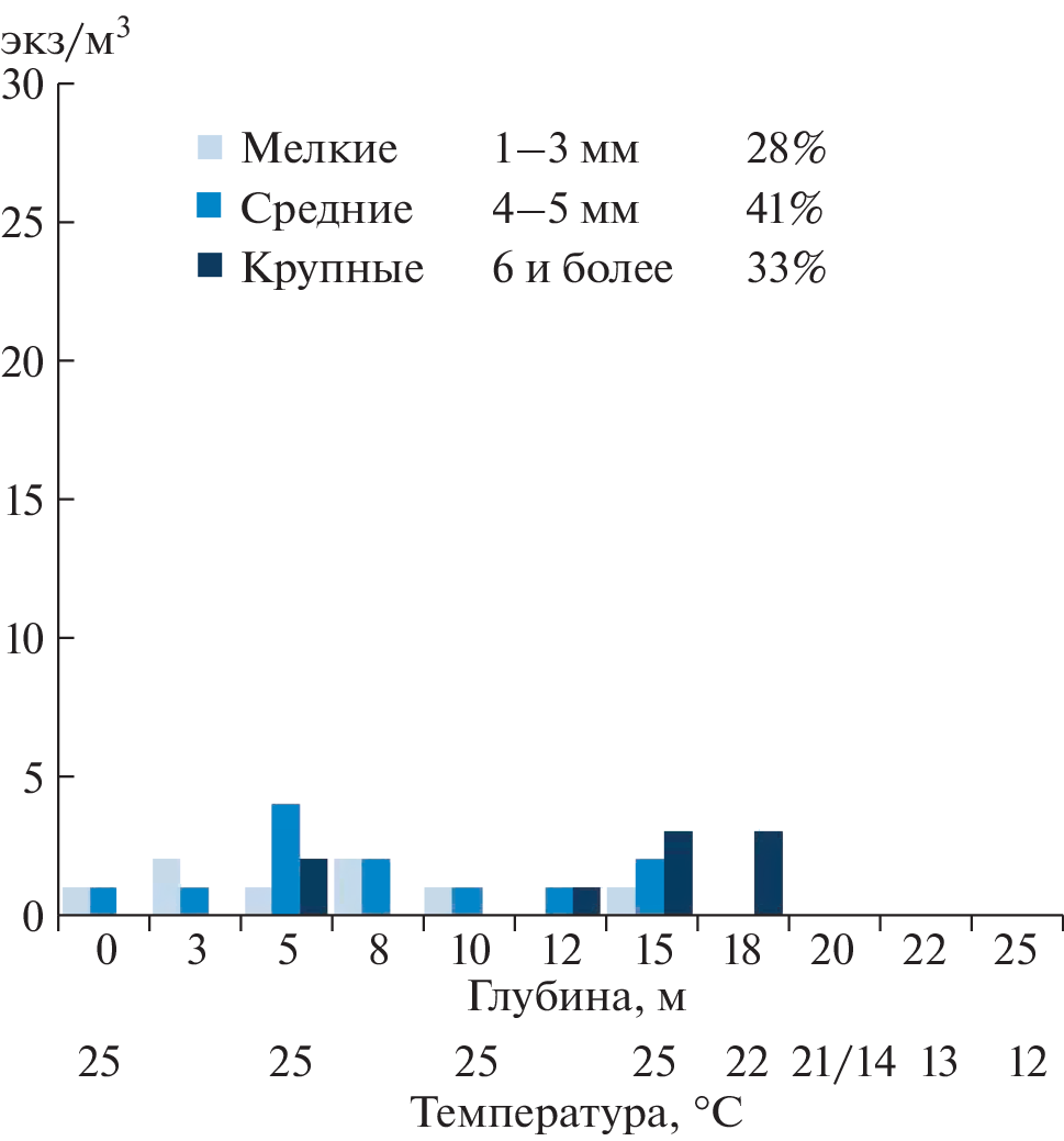 The latitudinal distribution of the ctenophores Mnemiopsis leidyi A. Agassiz, 1865 and Beroe ovata Bruguière, 1789 in the Russian sector of the Caspian Sea has different borders of their ranges. Studies on the occurrence of ctenophores in the water column have demonstrated that each species has a characteristic temperature limit of its vertical distribution. Investigations into interactions between ctenophores showed a considerable abundance suppression of M. leidyi (particularly of smaller individuals) by B. ovata.