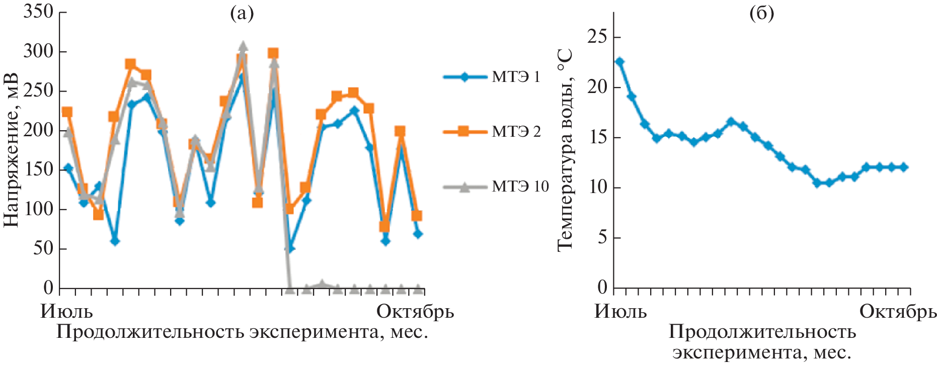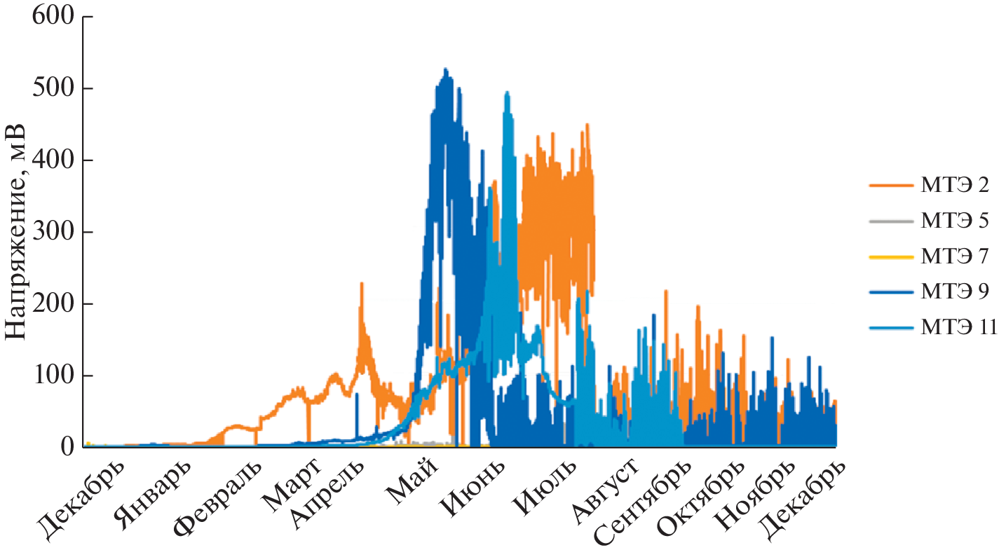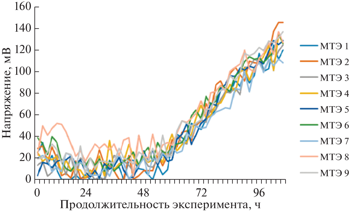 The bioelectrogenic activity of sediments of natural microbial association of the Peter’s Bay of Japanese sea research was performed in a year-round experiment with parallel temperature, illumination and water electrical conductivity monitoring by means of benthic microbial fuel cell (MFC) and automatic online-monitoring. Several variants of underwater devices, including benthic microbial fuel cells, monitoring water environment sensor,information collection and transmission systems, have been developed. This device make electrical voltage up to 216 mV, specific power up to 239 mW/m2. Electrogenic activity of natural microflora depends on water temperature and reach maximum on summer with temperature about 20–25°C. The introduction of toxicants in form as hydrocarbons and cadmium into the sluge led to the suppression of microbial electrogenesis. However the introduction of inductor substances of microbial sulfidogenesis led to the stimulation of microbial electrogenesis. The possibility of functioning of the benthic MFC in the field of the Peter’s Great Bay in various climatic periods is shown. It is shown that such experimental devices serve as a basis for autonomous stations monitoring the state of the aquatic environment for a long time and in a wide range of conditions change. Thus, automatic registration of temperature, illumination and salinity of water with a frequency of 48 times a day was carried out for 13 months (11/28/2019–12/31/2020). The electrogenic activity of this microbiota upon MFC scaling can potentially become a new renewable energy source for low-power marine electronics, including those used in mariculture.