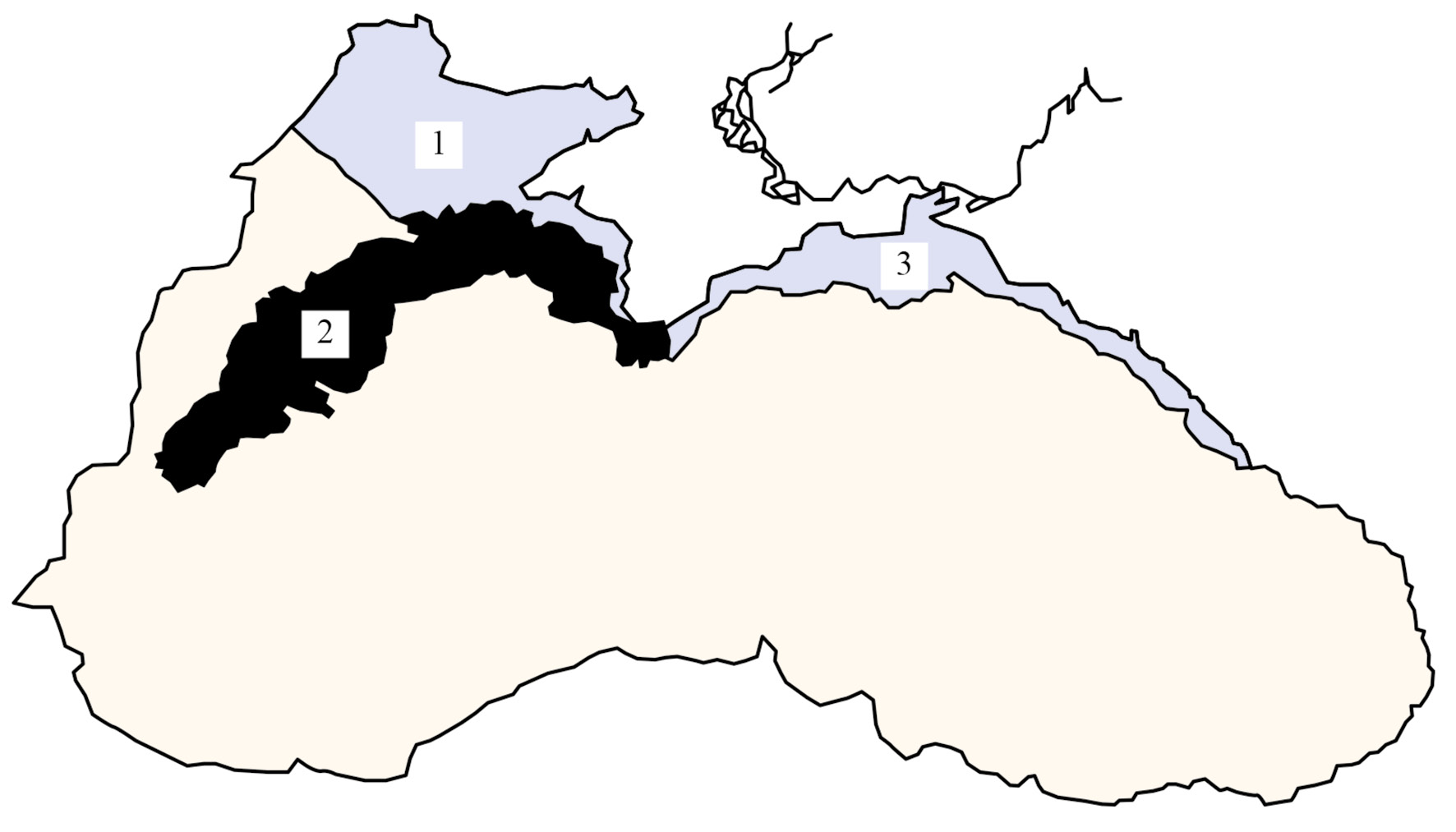 Рис. 1. Области расчета экологического риска: Приднепровский район северо-западного шельфа (1), область свала глубин от 50 до 500 м (2), область Кавказского и Крымского побережья (3)