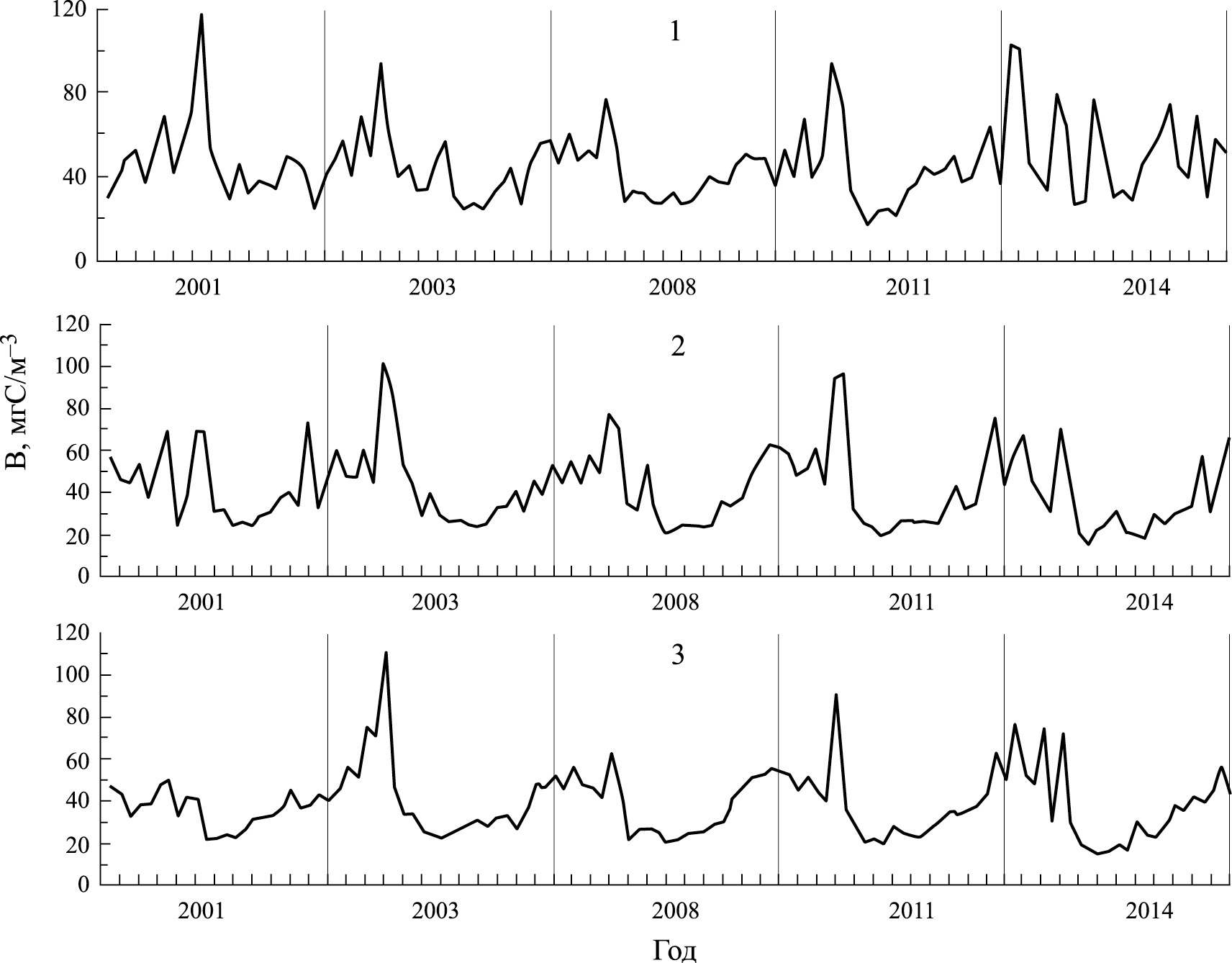 В настоящей работе использовали результаты модельных расчетов биомассы фитопланктона [7, 15, 16] в акваториях 1–3 (см. рис. 1). Расчеты были проведены по данным наблюдений, полученным спутниковым сканером SeaWiFS в 2001 и 2003 гг., и MODIS-Aqua и MODIS-Terra в 2008, 2011 и 2014 гг. [7]. Для биомассы фитопланктона использовали спутниковые данные SeaWiFS\R2018.0\MLAC\ Level-2, MODIS-Aqua\R2018.0\LAC\Level-2 и MODIS-Terra\R2018.0\LAC\ Level-2 [30] https://oceancolor.gsfc.nasa.gov/ (дата обращения 22.05.2019). Концентрация хлорофилла, рассчитана на основе алгоритма, разработанного в Морском гидрофизическом институте для SeaWiFS и MODIS [37]. Температура в поверхностном слое получена из спутниковых наблюдений MODIS-Aqua/Terra, интенсивность ФАР в диапазоне 400–700 нм [31] https://oceancolor.gsfc.nasa.gov/ (дата обращения 22.05.2019). Осредненные за двухнедельный период данные использовали для расчетов биомассы фитопланктона с помощью модели [15], разработанной на культурах десяти видов водорослей. Результаты модельных расчетов [7, 15, 16] сезонных вариаций биомассы фитопланктона (рис. 2) показали непостоянство периодов и масштабов «цветения» для шельфовых акваторий 1–3 (см. рис. 1). Так, в 2001 г. в акватории 3 наблюдались невысокие значения биомассы на протяжении всего года без выраженных максимумов, тогда как в акватории 1 отмечен пик в июне с биомассой до 117 мгС/м3, этот максимум проявился и в акватории 2 (см. рис. 2). Незначительное повышение биомассы в районах 1 и 3 наблюдалось во второй половине октября. В 2003 г. в трех районах на фоне более высоких зимних величин выражен мартовский максимум, при этом наибольшим он был в акватории 3 – до 110 мгС/м3. Летний пик в области 1 сместился к июлю и был значительно ниже. Незначительный осенний максимум отмечен в областях 1 и 2. В 2008 г. максимальные значения биомассы не превышали 78 мгС/м3 и наблюдались весной. Для 2008 г. заметно увеличение значений биомассы планктона во второй половине октября по сравнению с предыдущими двумя годами. Повышенные значения в зимний период и весенний пик в марте-апреле с биомассой до 100 мгС/м3 наблюдались в 2011 г. Осеннее возрастание биомассы в этом году происходило с сентября в области 1 и с октября в области 2. В 2014 г. наибольшим в годовой динамике был зимний пик в трех районах с биомассой до 100 мгС/м3. Мартовский максимум во всех исследуемых районах достигал 80 мгС/м3. В течение 2014 г. наблюдалось существенное возрастание значений биомассы в мае, сентябре, октябре, ноябре в области 1 и в осенний период в области 2.