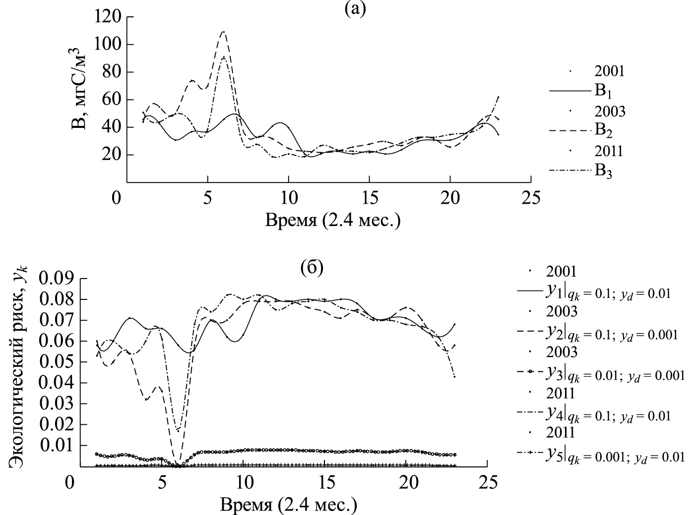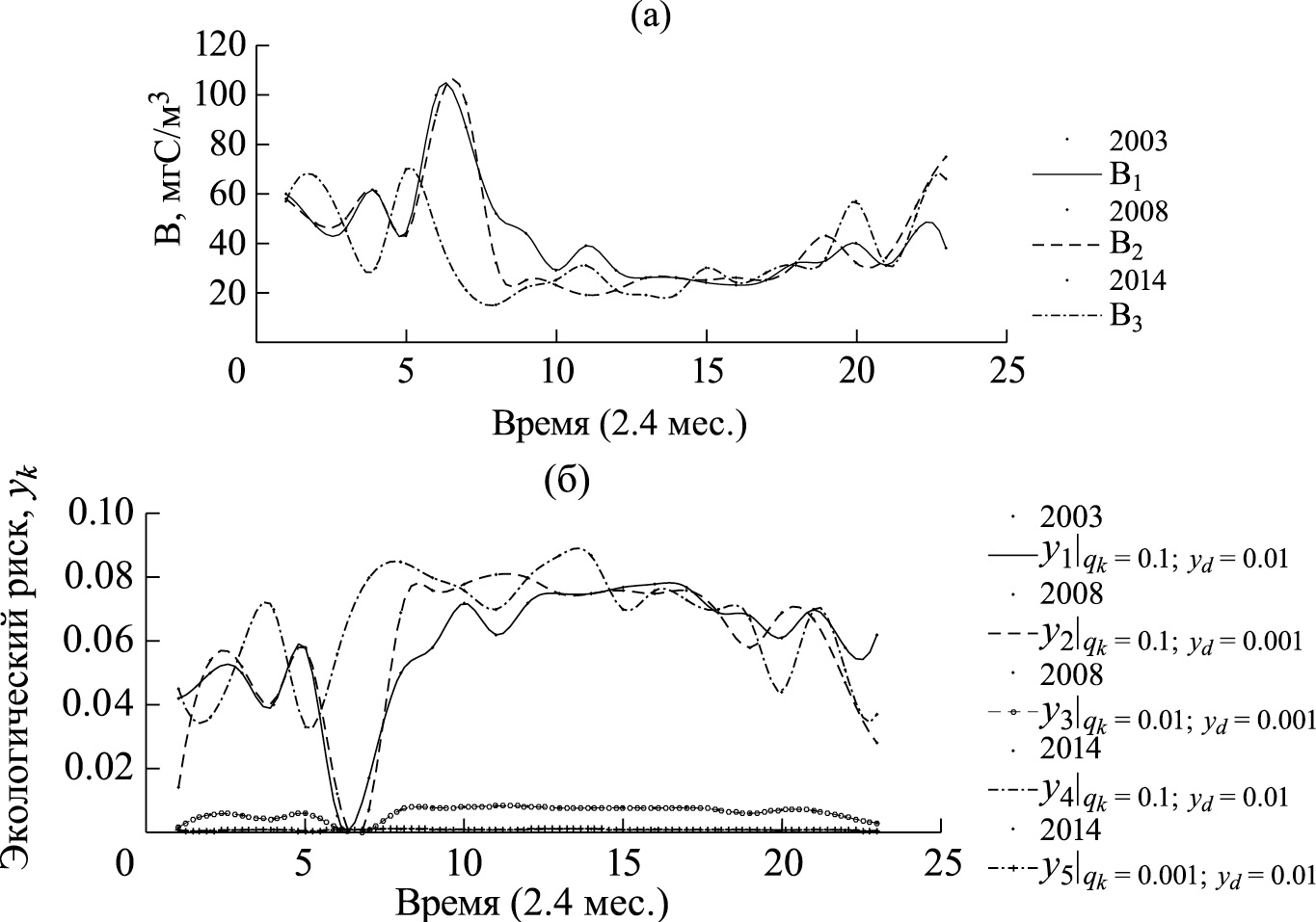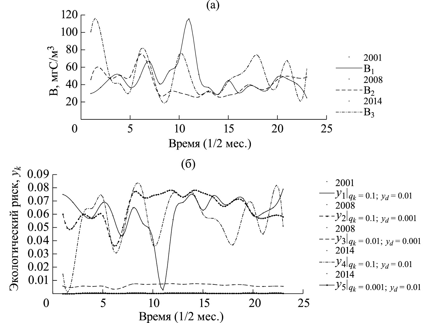 Чтобы показать значимость внутригодового состояния экосистемы и ее компонентов для оценки риска в модели, поддерживались постоянными значения воздействий со стороны стрессоров техногенного происхождения qk в диапазоне от 10–3 до 10–1 и параметра yd, ассоциированного с качеством среды, в диапазоне от 10–3 до 10–2. Для трех акваторий шельфа (см. рис. 1) были выбраны внутригодовые вариации значений биомассы: в 2001, 2008 и 2014 гг. — для акватории 1; в 2003, 2008 и 2014 гг. — для акватории 2; в 2001, 2003 и 2011гг. — для акватории 3 (рис. 3а, 4а, 5а). В каждом варианте модельных расчетов задавались значения Nmax, Ncr, pam, p’am, Emν, E’mν соответственно выбранному году.
