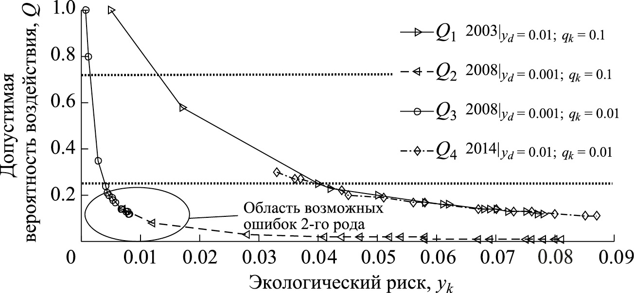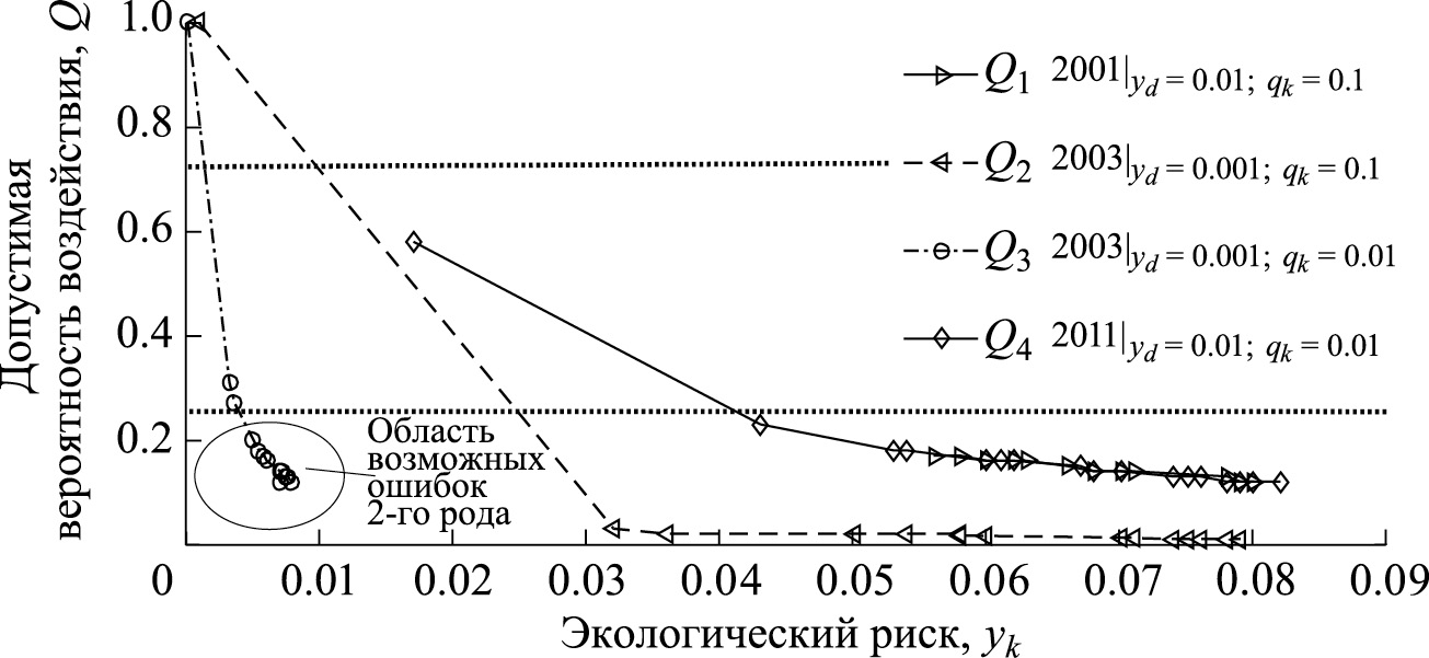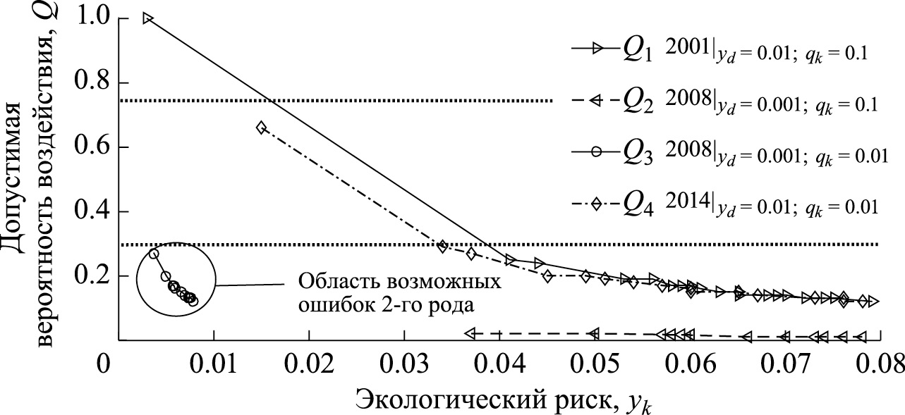 где Q(t) – предельно допустимая вероятность антропогенного воздействия на экосистему; yk(t) определяется уравнениями (3); yd — предельно допустимый риск для экосистемы при различных требованиях к сохранению качества среды.
