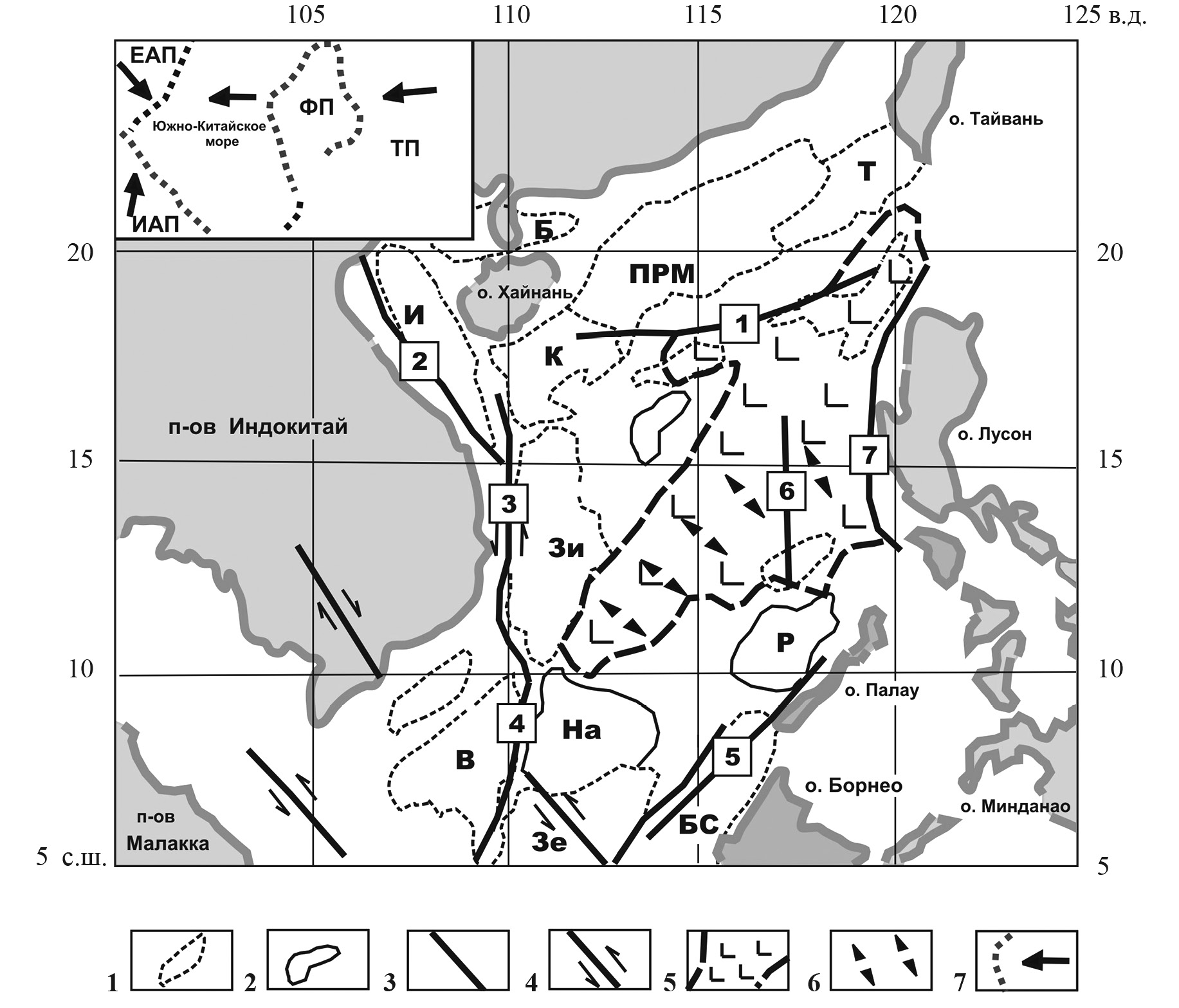1 ‒ осадочные бассейны: И – Инджехай (Yinggehai), В – Байбуван (Baibuwan), К – Квиндоньнан (Qiongdongnan), ПРМ – Перл Ривер Mаунт (Perl River Mounth), Т – Тайвань (Taiwan), Зи – Зонджианьнан (Zhongjiangnan), В – Ванань (Wanan), На –Нанвейси (Nanweixi), Зе – Зенью (Zengniu), БС – Вруней-Саба (Brunei-Cabah); 2 – подводные возвышенности: На ‒ Наньша (Nanshan), Р – Рид (Reed); 3 – главные разломы; 4 ‒ сдвиги (4), наименования показаны цифрами в квадрате: 1 – Кьеннань (Qiongnan), 2 – Вестерн-эйдч (Western-adge), 3 ‒Ваньян (Wan’an), 4 – Натуна (Natuna), 5 – Бясянь-Гуе (Baxian-Guyo), 6 – Жоньнан (Zhongnan), 7 – Манила (Manila); 5 – океаническая кора в зоне спрединга; 6 – ось спрединга; 7 – границы плит и векторы их перемещения. Обозначения литосферных плит: ЕАП – Евроазиатская, ИАП – Индо-Австралийская, ФП – Филиппинская, ТП – Тихоокеанская