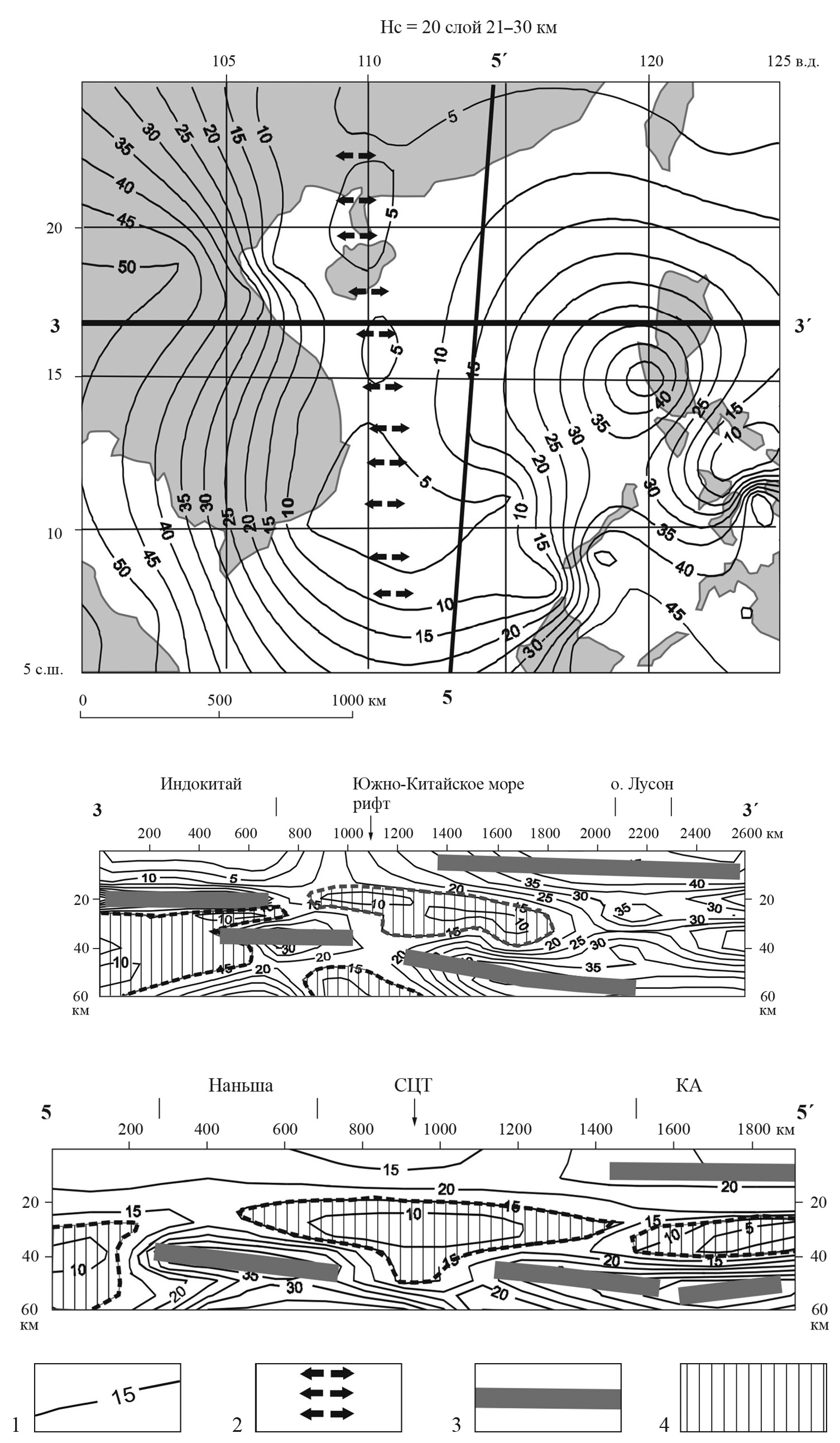 - позже следует субдукция Филиппинской (или протоокеанической плиты Южно- Китайского моря?) под зону спрединга (разрез 3-3′ на рис. 5); филиппинская субдукция завершается (или сопровождается?) растяжением и сдвигом в широкой зоне СВ простирания в диапазоне глубин 120–150 км (см. рис. 4);