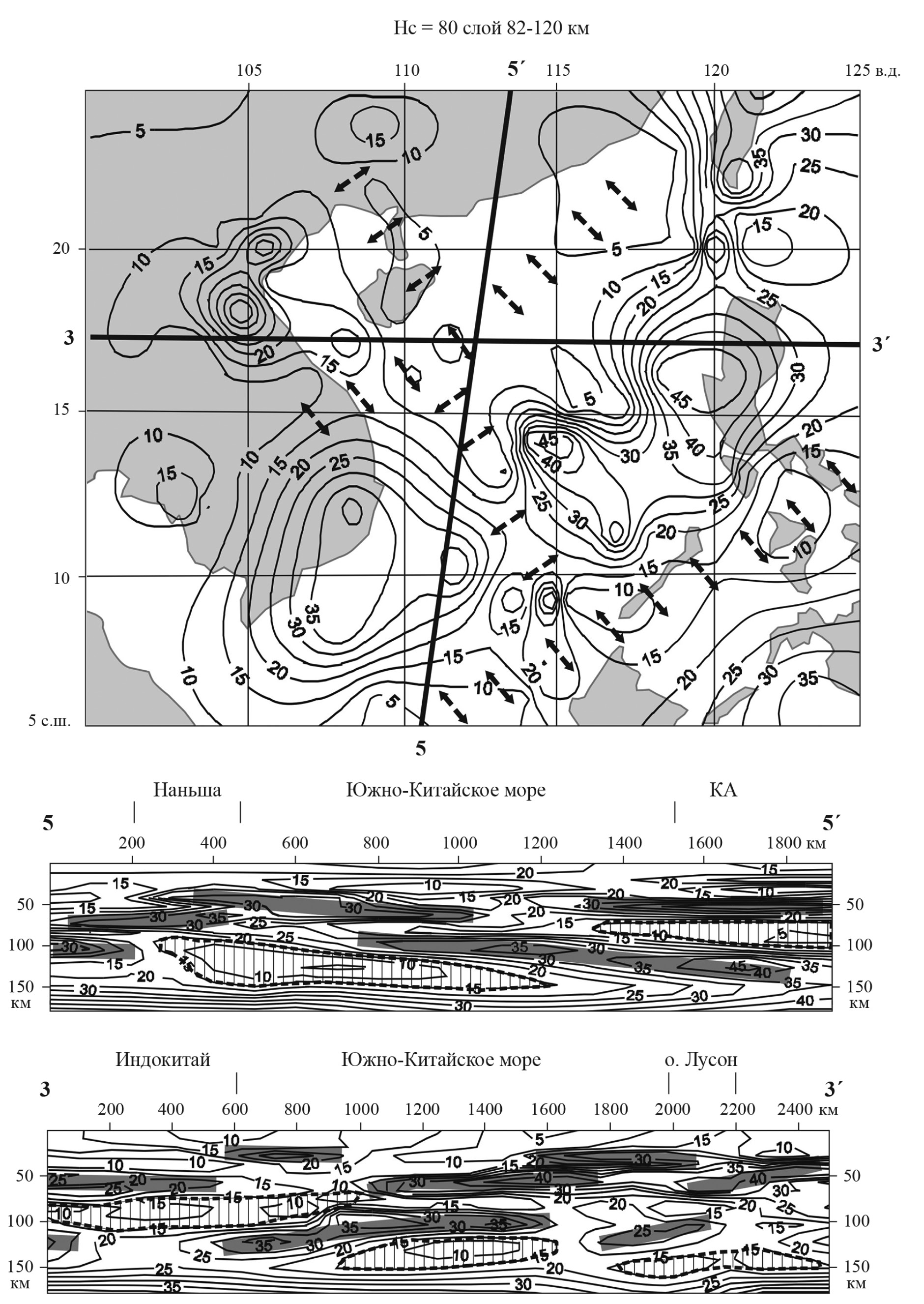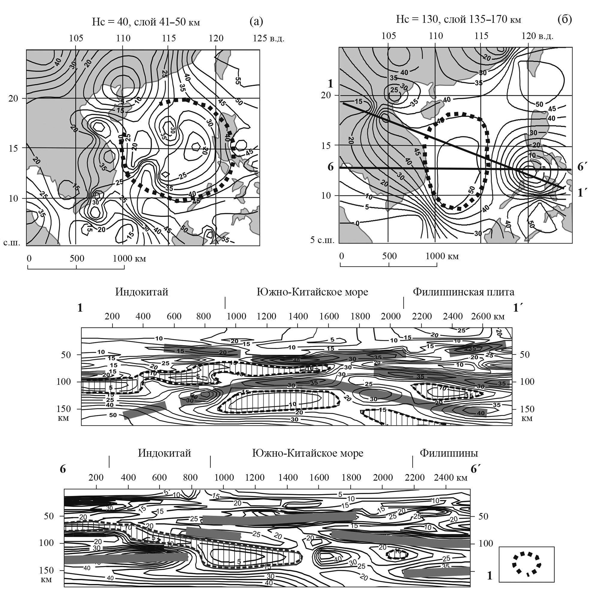 В срезе на глубине 130 км (рис. 7б) эта структура выражена отчетливым максимумом, что предполагает существование в основании структуры мантийного диапира. Повышение µz-параметра в центре СЦТ на этой глубине в общих чертах соответствует тектоническим и сейсмическим моделям, предполагающим сокращение мощности литосферы в центре Южно-Китайского моря [23, 39, 53]. В разрезе 1-1′ морфология литосферного и подастеносферного жестких слоев характеризуется инверсными взаимоотношениями: первый слой прогнут, а второй — выгнут к земной поверхности (разрез 1-1′ на рис. 7), что часто проявляется в тектономагматических СЦТ различного ранга, в том числе — в головах плюмов [15]. Признаки структуры центрального типа в Южно-Китайском море проявлены и в подкоровом слое верхней мантии (см. разрезы на рис. 3). В разрезе 3-3′ подкоровая зона пониженной вязкости выгнута к поверхности, а в разрезе 5-5′ (см. рис. 3) она имеет грибовидную форму, типичную для этого типа структур.