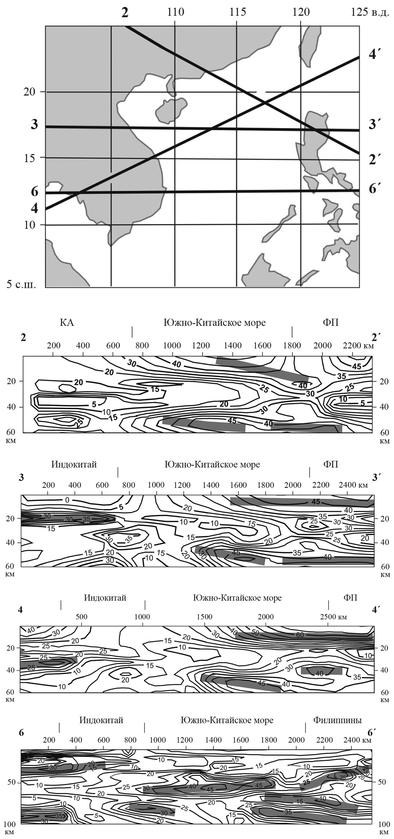 - наиболее ранним, по-видимому, является спрединг в центре ЮКМ, проявленный в вертикальном диапазоне глубин 0–60 км в центре моря (разрез 3-3′ на рис. 3) на месте протоокеанической плиты Южно-Китайского моря [21, 45, 47]; о более раннем возрасте спрединга свидетельствует отсутствие разрывов субдуцирующих пластин в центре Южно-Китайского моря.