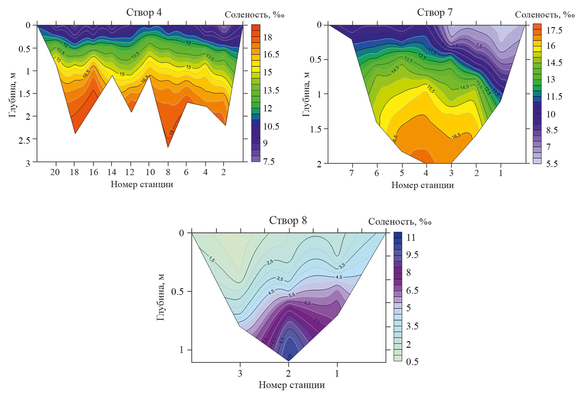 По результатам обработки полученных с CTD-зонда данных сделаны оценки распределения солености в створах по направлению к вершине устья р. Черной (рис. 6). На профилях хорошо визуализируется расслоение водного потока. Наибольший вертикальный градиент солености, рассчитанный между поверхностью и дном, в нижней части участка работ наблюдался на ст. 8 створа 4 и составлял 3.14 ‰/м. По данным измерений в створах 7, 8 видно, что характер расположения потоков соленой и пресной воды в целом не изменялся, в то время как соленость воды по направлению к реке закономерно уменьшалась, а расслоение возрастало. Так, максимальный вертикальный градиент на ст. 2 створа 8 достигал 7.72 ‰/м.