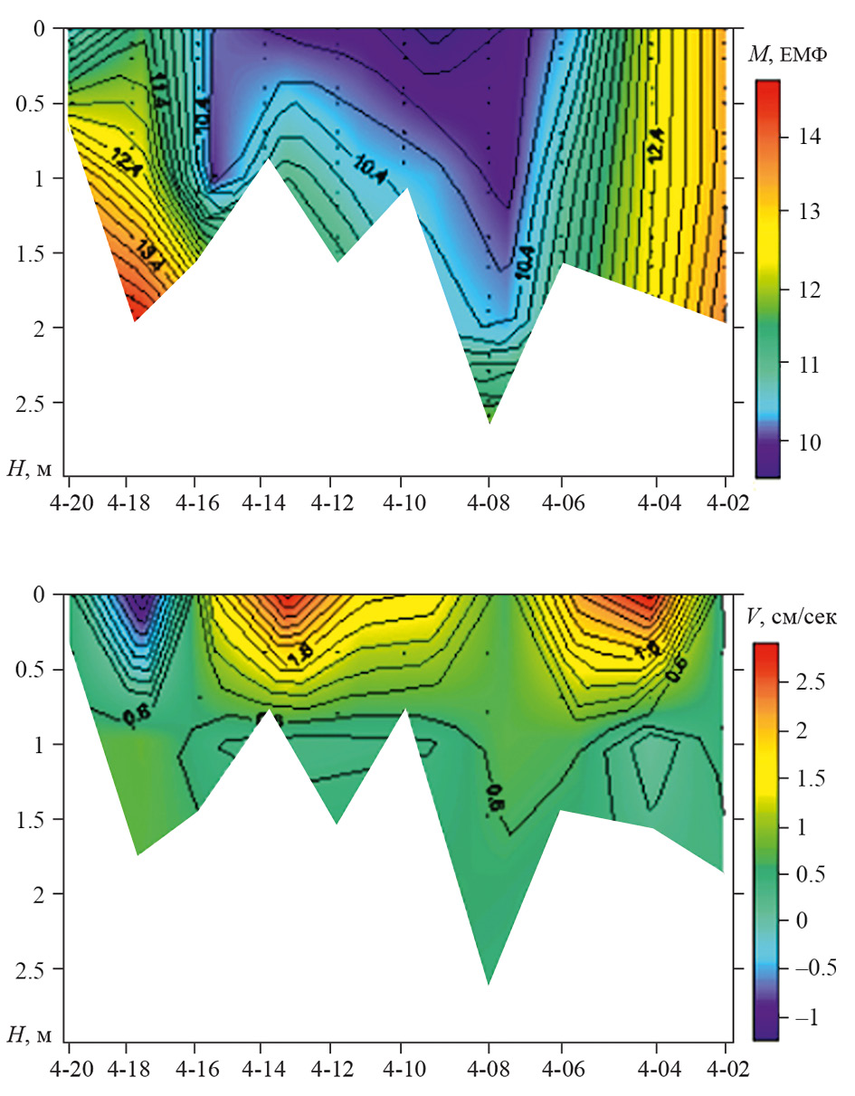 Измерения выполняли на каждой станции методом зондирования до дна со скоростью порядка 0.2 м/с. Для измерения скорости и направления течения при достижении дна комплекс приподнимался на 0.1–0.2 м и выполнялась его выдержка на горизонте в течение 30–60 с для получения осредненных данных. Затем комплекс приподнимался на 0.5 м и вновь проводилось измерение скорости и направления течения — и так до поверхностного 0.5-метрового слоя воды. Пересчет измеряемых единиц мутности (ЕМФ) в весовые единицы (мг/л) для расчета концентрации общей взвеси проводился в соответствии с методикой, описанной в работе [15]. Пример построенных распределений мутности и скорости течения представлен на рис. 8.