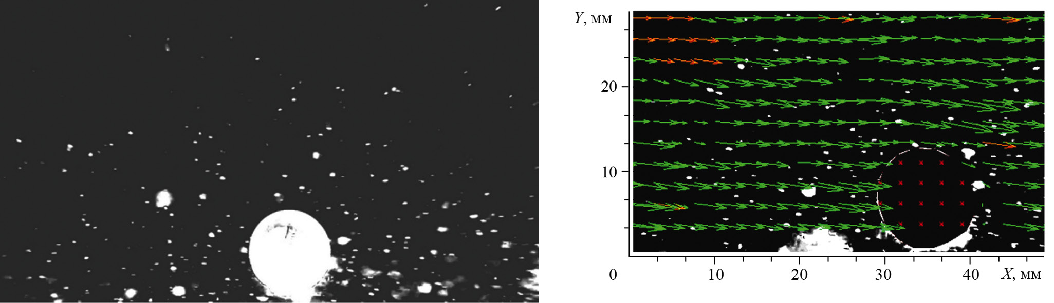 Рис. 10. Пример полученного изображения (слева) и построенное мгновенное поле скорости течения в поверхностном слое воды (справа)