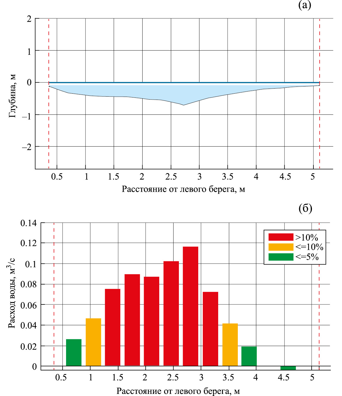 Значения переходного коэффициента k было выбрано равным 0.8 в соответствии с методикой [7] для глубин водного потока до 1 м песчано-галечного русла с ровными берегами без растительности. Для верификации нового метода применялся стандартный метод с использованием поплавков нейтральной плавучести [10]. Расхождения в результатах определения расхода воды с помощью обоих методов не превышали 10%.