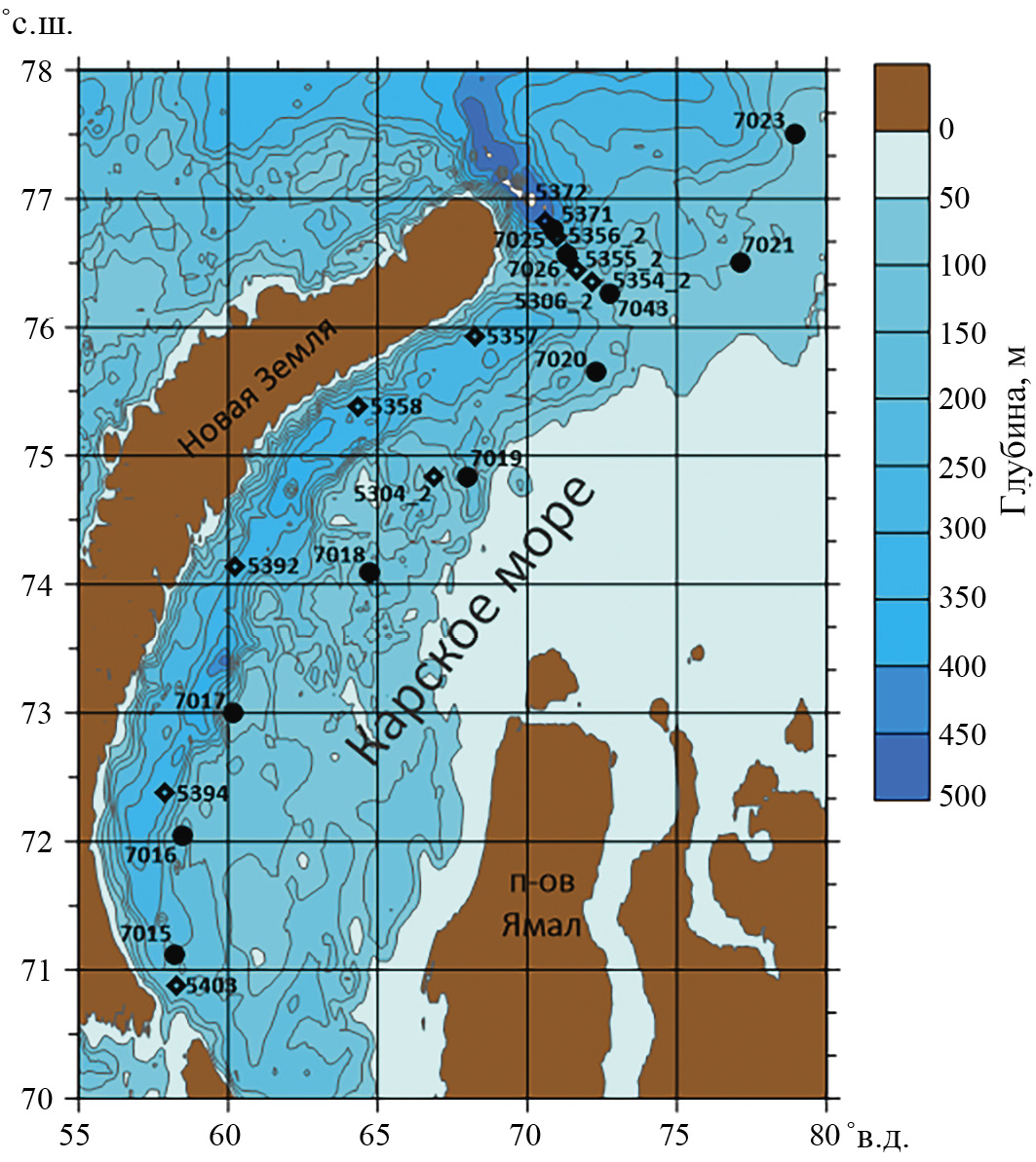 Рис. 1. Карта-схема района работ. ♦ – 66 рейс НИС “Академик Мстислав Келдыш”; ● – 83 рейс НИС “Академик Мстислав Келдыш”