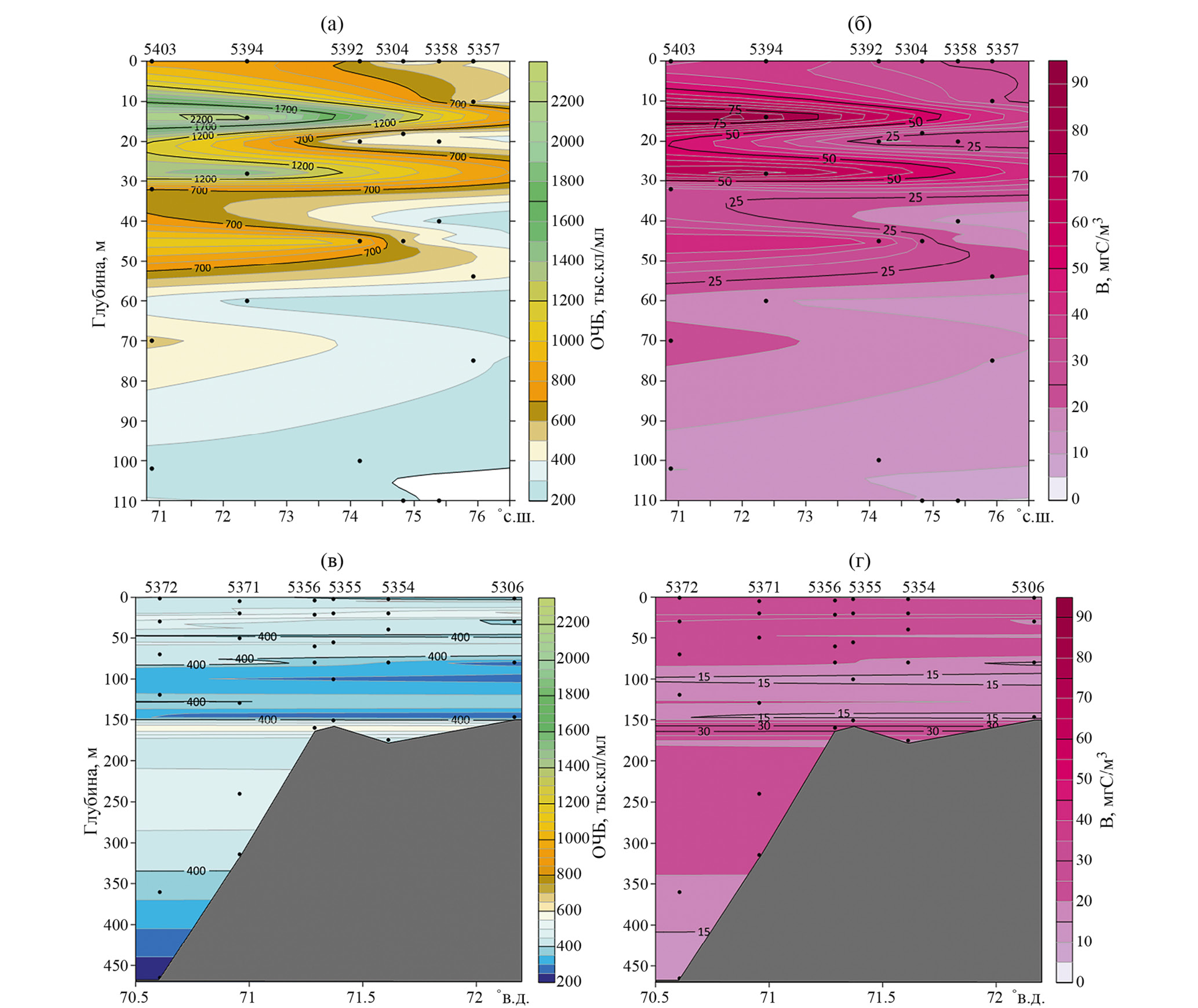 В июне 2021 г. работы выполнялись вдоль кромки сезонного льда (срок отступления ледового покрова с точек отбора составлял от 1 до 6 дней [1]), а также вдоль склона западного отрога желоба Св. Анны. Средние для столба воды величины обилия бактериопланктона вдоль ледовой кромки составляли от 186 до 554 тыс. кл/мл или 8.5–30 мгС/м3 (рис. 2а, б). В то же время над склоном западного отрога желоба Св. Анны, где открытая вода наблюдалась на протяжении более чем 25 суток, обилие бактериопланктона было выше, составляя в среднем для столба воды 594–708 тыс. кл/мл или 26.4–36.5 мгС/м3 (рис. 2в, г).