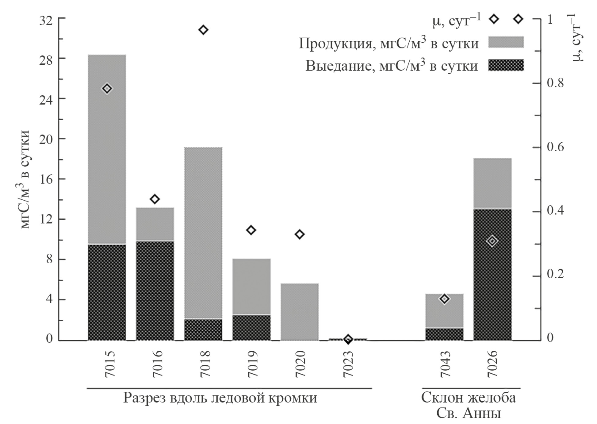 Величина продукции бактериопланктона в поверхностном слое воды на разрезе вдоль кромки льда снижалась в северо-восточном направлении с 28.5 до 0.21 мгС/м3 в сутки (рис. 3). Та же тенденция наблюдалась и для величины выедания бактериопланктона потребителями, которая снижалась с 9.6 мгС/м3 в сутки до нулевых значений. Над склоном западного отрога желоба Св. Анны разница в величине продукции бактериопланктона в поверхностном слое станций над склоном и на внешнем краю шельфа составляла почти четыре раза (18.2 и 4.7 мгС/м3 в сутки на станциях 7026 и 7043 соответственно), более чем на порядок различался и вклад потребителей бактериопланктона. В слое пика флуоресценции на большинстве станций значения удельного роста бактериопланктона либо оставались неизменными, либо увеличивались по сравнению с наблюдаемыми в поверхностном слое. Исключение составила станция 7015, на которой величина удельного роста снижалась с 0.78 до 0.28 сут–1. В отличие от других точек, где проводились измерения продукции, на этой станции максимальные концентрации хлорофилла были приурочены к горизонту 2 м, тогда как другие станции отбора характеризовались либо наличием подповерхностного максимума хлорофилла, либо близкими величинами концентрации хлорофилла в поверхностном слое и на горизонте у границы верхнего перемешанного слоя [1].