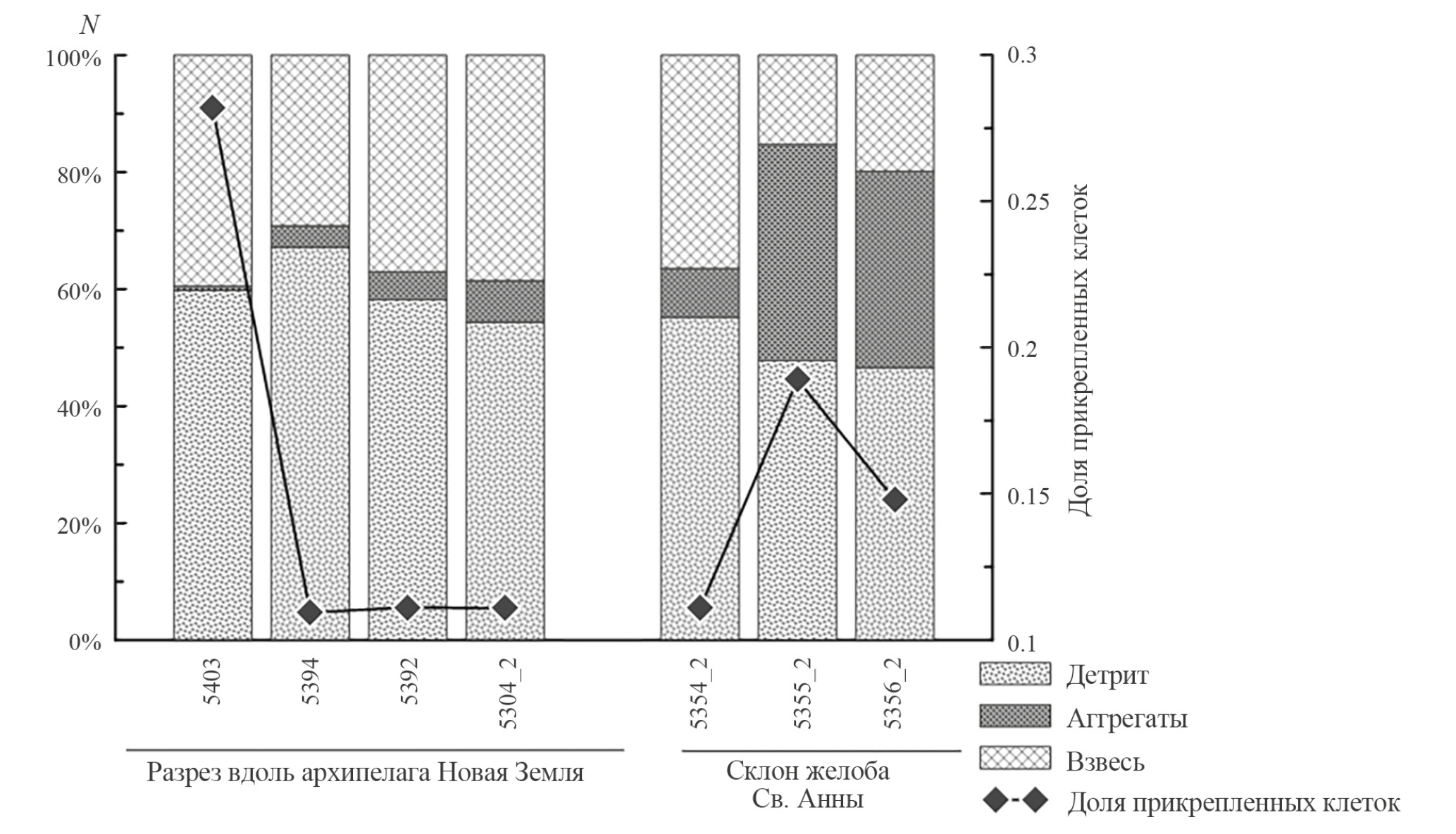 Вклад прикрепленных клеток в общее обилие бактериопланктона на большинстве станций не превышал 20%, исключение составила только южная станция разреза вдоль Новой Земли (ст. 5403), где среднее значение этого показателя для столба воды составляло 28% общей численности (рис. 5). Большая часть прикрепленных клеток была ассоциирована с детритными частицами. Станции над склоном желоба Св. Анны характеризовались относительно высокой долей аггрегатов среди прикрепленных клеток (18–50%, рис. 5). На разрезе вдоль Новой Земли этот показатель не превышал 15%, а доля клеток, прикрепленных к минеральным частицам, возрастала с увеличением глубины.