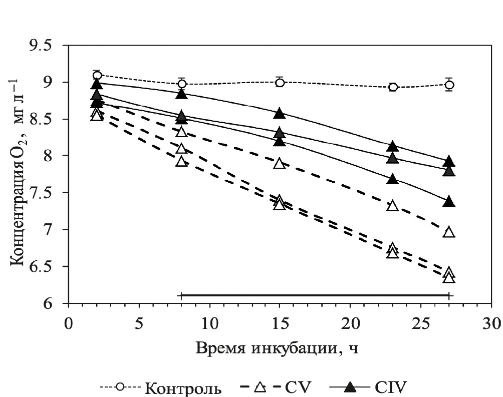 Отрезок времени, для которого производился расчет скорости потребления кислорода копеподами, указан линией внизу графика.