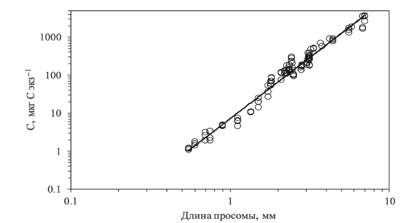 Зависимость содержания углерода (мкг C/экз) от длины просомы (L) у пяти видов арктических копепод в диапазоне размеров от 0.55 мм (Oithona similis) до 6.9 мм (самки Calanus hyperboreus) описана уравнением C = 6.98 L3.221, что хорошо согласуется с данными, полученными для отдельных видов из других районов Арктики.