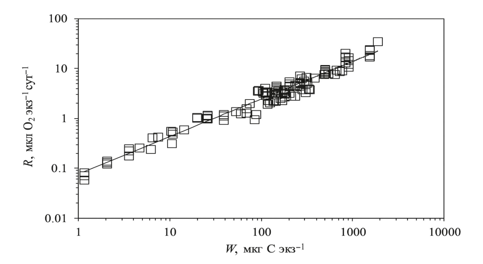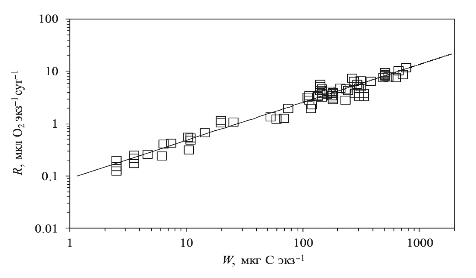 Полученная нами аллометрическая зависимость скорости дыхания (R) от содержания углерода в теле копепод (W) в диапазоне веса, составляющего три порядка величин, описывается уравнением R = 0.077 W0.753, то есть, значение степени b соответствует “степенному закону ¾” (“3/4-power law”).