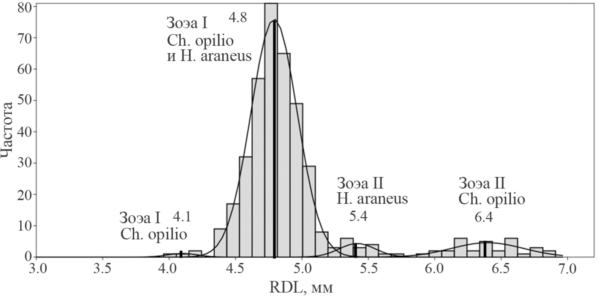 Анализ с помощью разделения смешанного распределения на нормально распределенные группы размеров RDL всех измеренных личинок выявил нестабильный результат для четырех размерных групп (средние значения RDL ± стандартное отклонение 4.1 ± 0.1, 4.8 ± 0.2, 5.4 ± 0.1 и 6.4 ± 0.3 мм соответственно; Log ik.hood = 304.3 и Akaike IC = –592.3) (рис. 4). При раздельном анализе размеров личинок для C. opilio стабильно определяются три размерных группы со средними значениями RDL ± стандартное отклонение: 4.1 ± 0.1 и 4.8 ± 0.2 мм — на стадии зоеа I, и 6.4 ± 0.3 мм — на стадии зоеа II (Log ik.hood = 395 и Akaike IC = –777.7). Анализ только личинок H. araneus выявил схожую с крабом-стригуном группу на стадии зоеа I (4.7 ± 0.2 мм) и отдельную группу на стадии зоеа II (5.5 ± 0.1 мм) (Log ik. hood = 395 и Akaike IC = –777.7). При раздельном анализе данных с каждой станции группа с малыми размерами (4.1 ± 0.1 мм) выделялась только на станциях у пролива Карские Ворота (ст. 6281 и 6282). На станции в центре Карского моря (ст. 6222) была найдена только одна личинка с малыми размерами (RDL 4.2 мм).