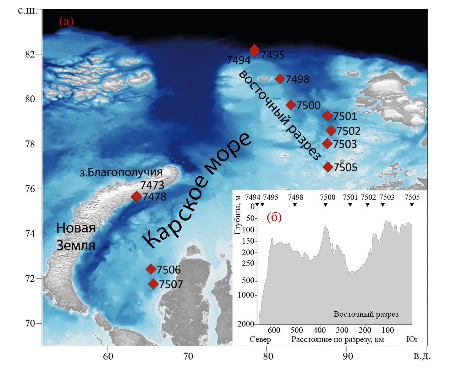 Исследования донных сообществ Карского моря с целью оценки их современного состояния были проведены в ходе 89 рейса НИС “Академик Мстислав Келдыш” (сентябрь–октябрь 2022 г.). Было выполнено 12 станций в трех районах моря (рис. 1) – в заливе Благополучия (2 станции), в западной части моря (2 станции), в восточной части моря на разрезе в диапазоне глубин от 1650 до 70 м (8 станций).
