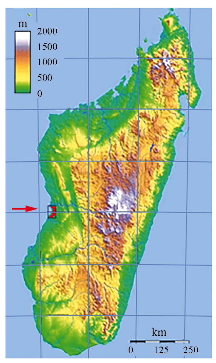 Рис. 1. Обобщенная орографическая карта Мадагаскара и расположение района Морондава [24]