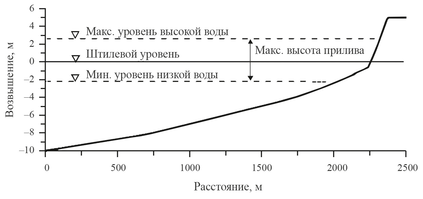 Рис. 6. Береговой профиль и диапазон приливных колебаний уровня