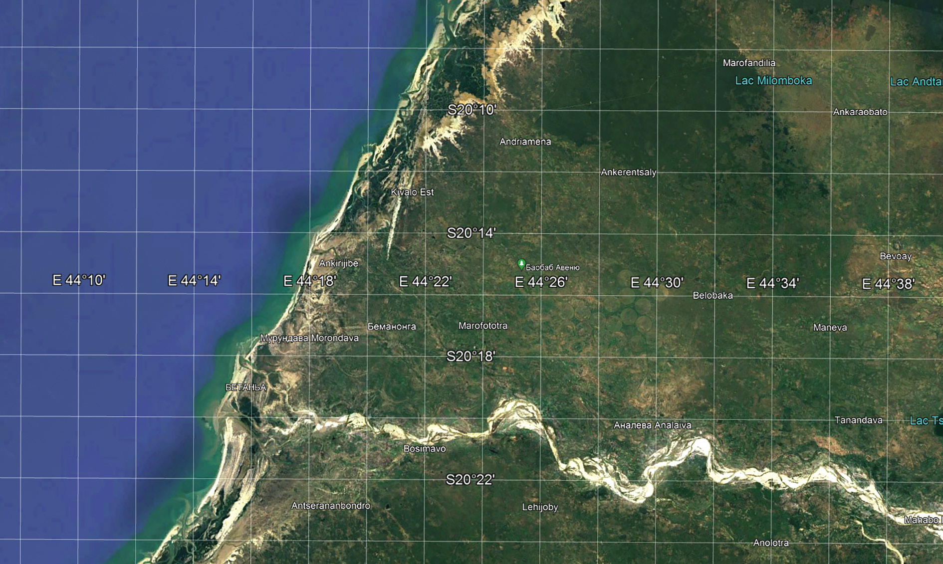 Рис. 7. Направление потока береговых наносов в районе Морондава (Google Earth Pro, 5. 1. 2022)