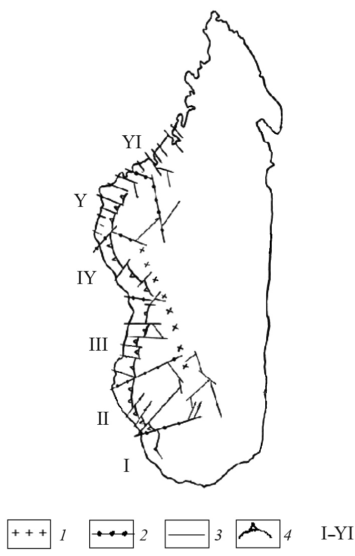 Рис. 8. Новейшая тектоническая структура западной окраины Мадагаскара (составил Н.Н. Дунаев): 1–3 – разрывные нарушения первого — третьего ранга, 4 – граница слабых конэрозионных приморских поднятий; I–VI — неотектонические домены