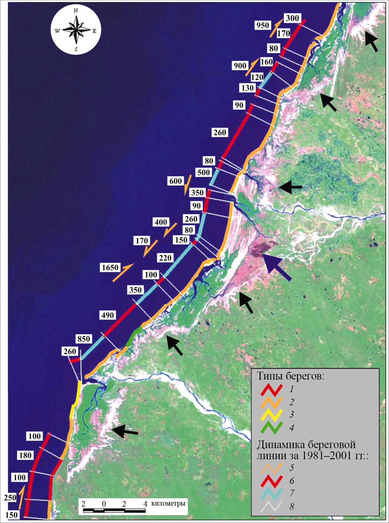 Рис. 9. Типы береговых участков и динамика береговой линии района Морондава (составила Т.Ю. Репкина). Типы берегов: 1 – аккумулятивно-абразионные, выработанные в песчаных отложениях морских террас; аккумулятивные: 2 – лагунные, 3 – лагунные, бронированные коралловой платформой, 4 – дельтовые. Динамика береговой линии за 1981–2001 гг. (цифры — максимальная величина смещения на участке, м): 5 – смещение вдоль берега, 6 – отступание, 7 – выдвижение; 8 – границы участков. Черными стрелками показано положение уступа, отделяющего приморскую аллювиально-морскую равнину от аллювиальных равнин, синей стрелкой — подтопленный участок дельты р. Морондава