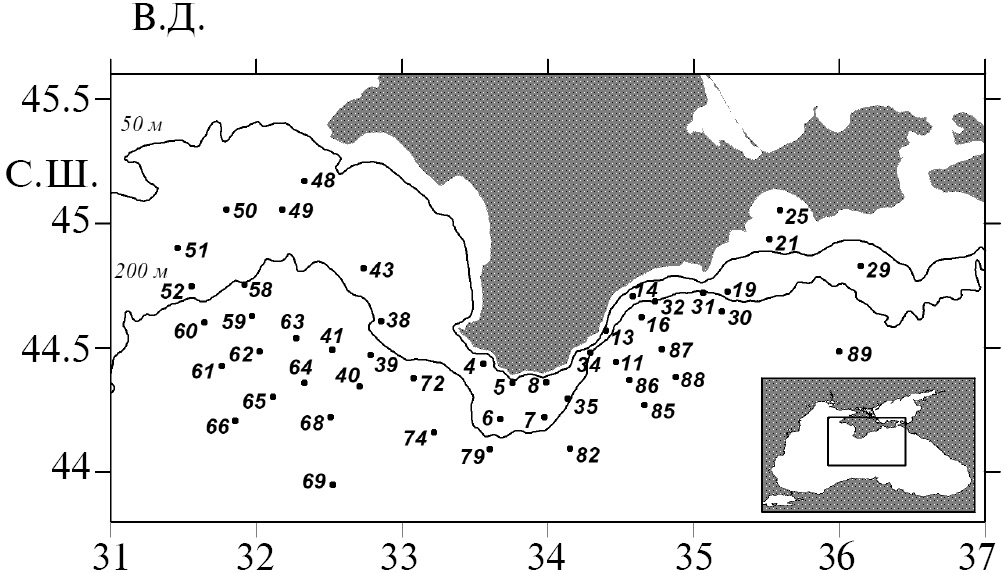 Популяцию С. euxinus исследовали в период с 15 по 27 ноября 2017 г. (98 рейс НИС “Профессор Водяницкий”) на 48 станциях, находящихся в глубоководной части (глубины > 200 м), а также зоне внешнего (глубины 50–200 м) и внутреннего (глубины < 50 м) шельфа Чёрного моря западнее и восточнее Крыма (рис. 1).