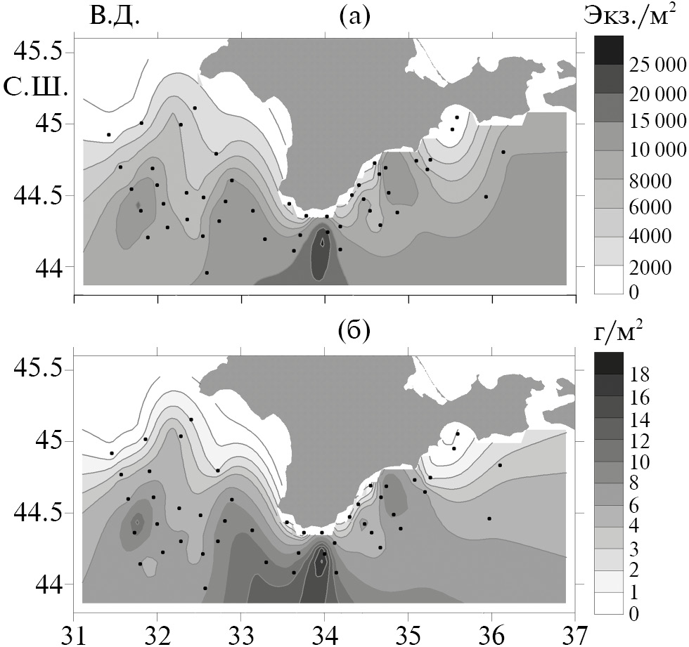 В последнем случае различия в численности и биомассе рачков подтверждаются статистически (p < 0.01). Вместе с тем непосредственно в ядрах антициклонических вихрей (Севастопольского и Крымского) также были обнаружены количественные пики численности и биомассы C. euxinus (см. рис. 2).
