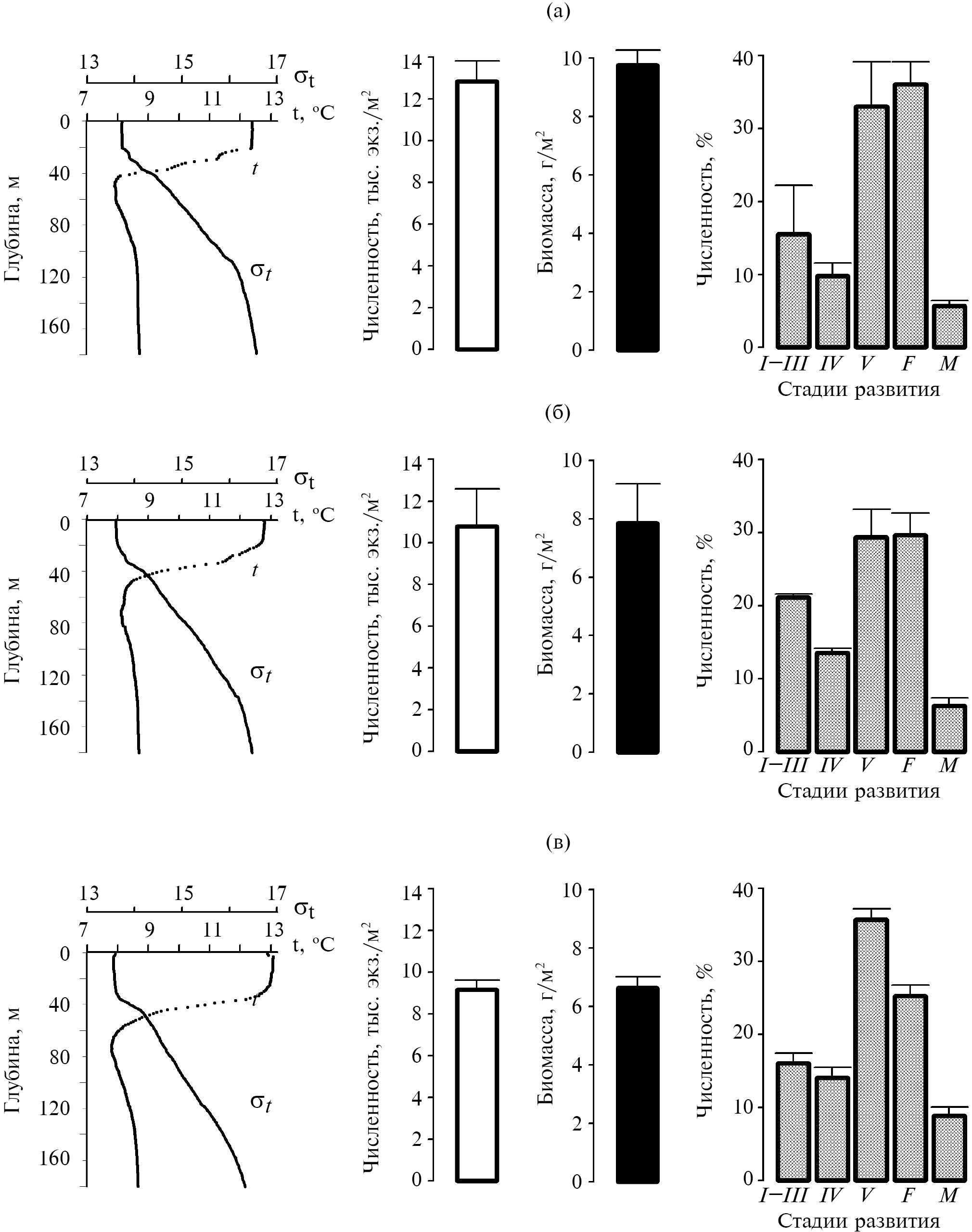 Рис. 3. Зависимость общей численности (экз/м2), биомассы (г/м2) и возрастной структуры (% общей численности) популяции Calanus euxinus от температуры (t°C) и относительной плотности (σt) морской воды в эпипелагиали Чёрного моря (0–185 м). Глубина нижней границы кислородной зоны моря (σt = 16.2): 100–125 м (а); 126–150 м (б); 151–185 м (в).