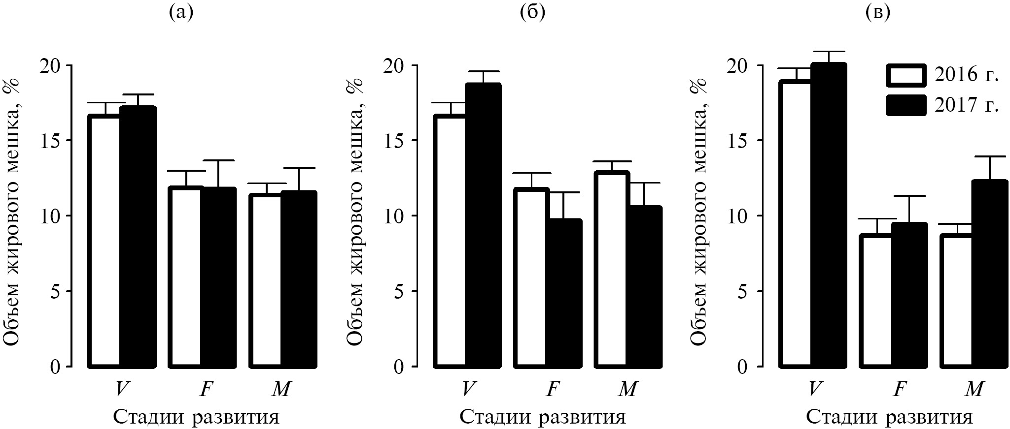 Рис. 5. Объём жировых мешков (% объёма тела) у V копеподитов (V), самок (F) и самцов (M) Calanus euxinus из районов Чёрного моря с разной глубиной залегания нижней границы кислородного слоя (σt = 16.2) в октябре 2016 и ноябре 2017 гг.: 100–125 м (а); 126–150 м (б); 151–185 м (в).