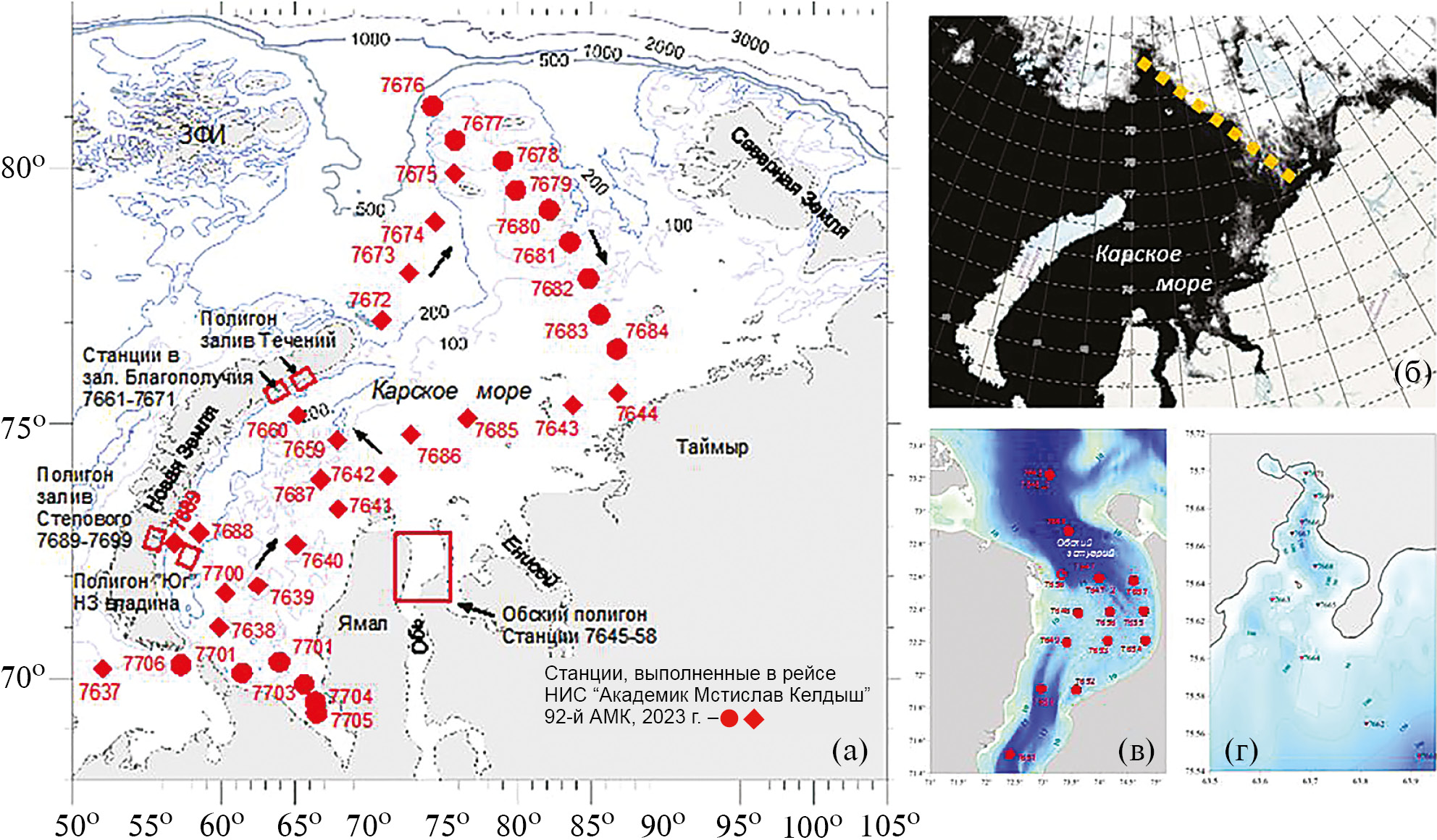 Рис. 1. Схема маршрута и положение станций 92-го рейса НИС “Академик Мстислав Келдыш” в Карском море в октябре–ноябре 2023 г. (а); положение ледовой кромки в восточной части Карского моря 23 октября 2023 г. (по http://siows.solab.rshu.ru) в период выполнения разреза “Восточный”, положение разреза показано желтым штрихом (б); положение станций в Обском эстуарии (в); положение станций в заливе Благополучия (г).