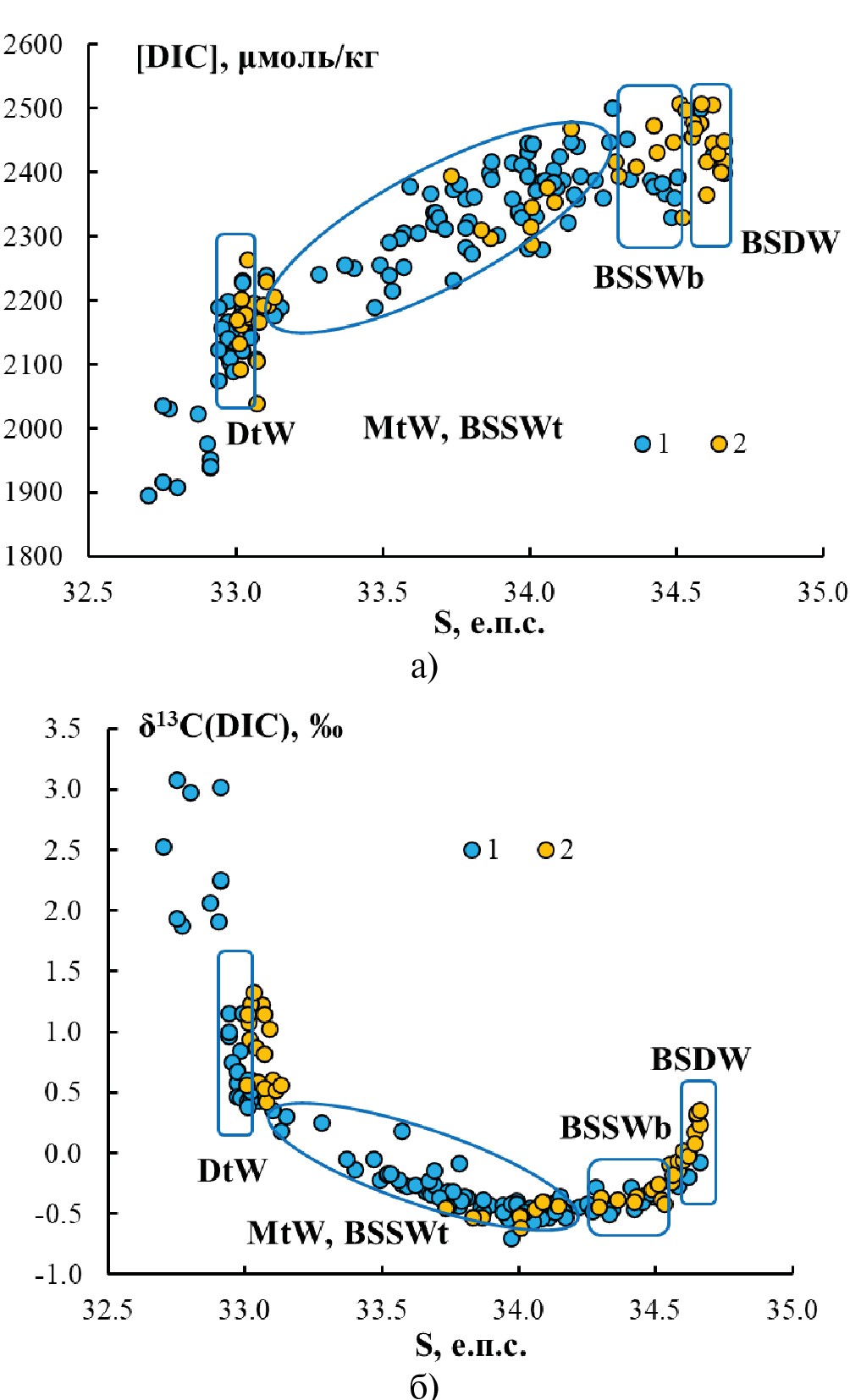 Рис. 2. TS диаграммы, на которых цветовая шкала соответствует величинам δ13С(DIC) (а) и [DIC] (б). Обозначения вод: BsSW – субповерхностные; DtW – дихотермальные; MtW – мезотермальные; BSSWt, b – промежуточные верхние и нижние, BSDW – глубинные воды Берингова моря [2].