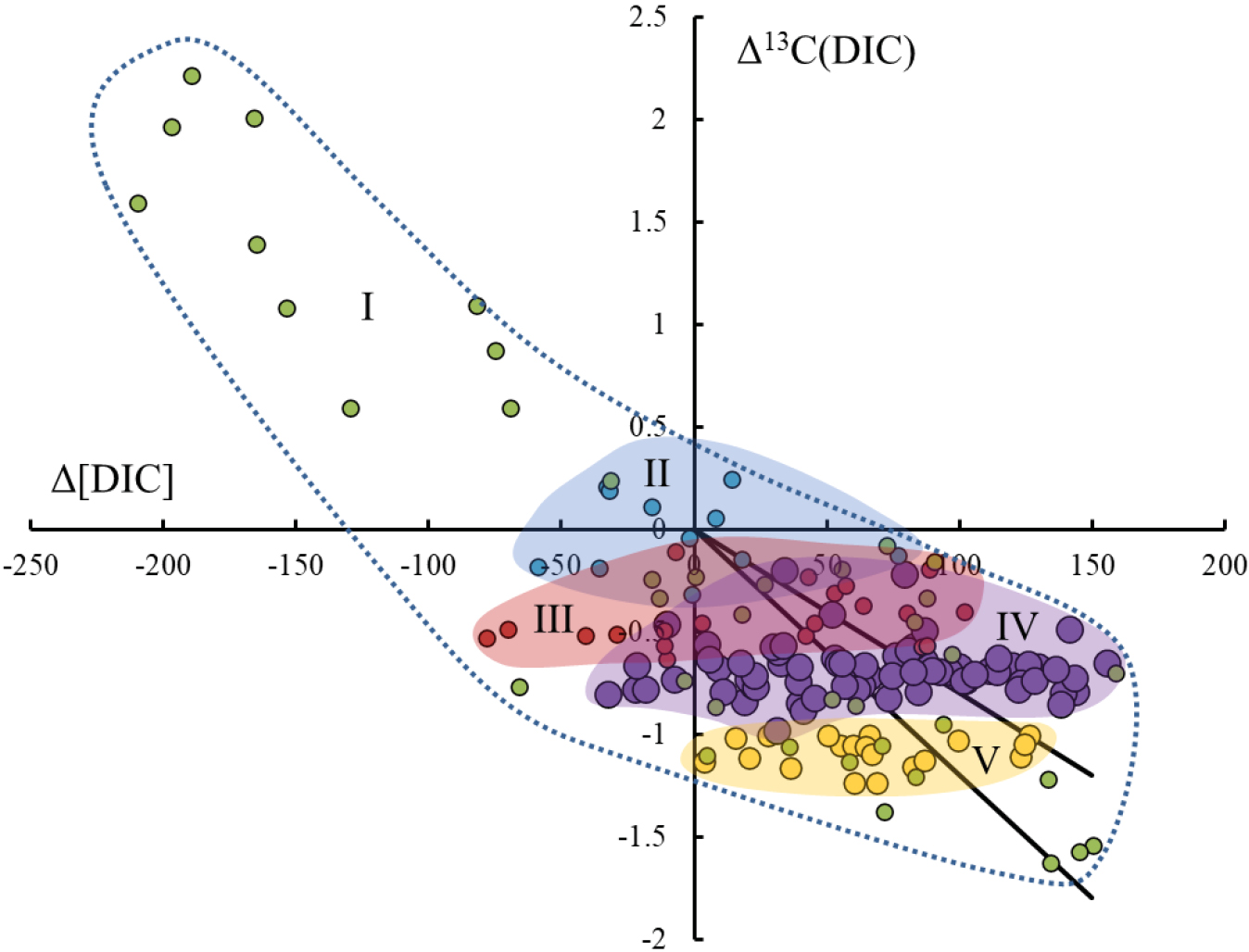 Рис. 10. Отклонение от физических моделей изотопного состава углерода и концентрации DIC для вод разного типа: I – субповерхностные воды (BsSW), II – глубинные воды BSDW, III, IV – промежуточные и глубинные воды (MtW, BSSWt, BSSWb), V – дихотермальные воды (DtW). Сплошные жирные линии – расчет трендов окисления ОВ с величинами δ13С органического вещества –20 и –24‰ (крайние значения интервала взяты согласно [31, 40, 45, 50].