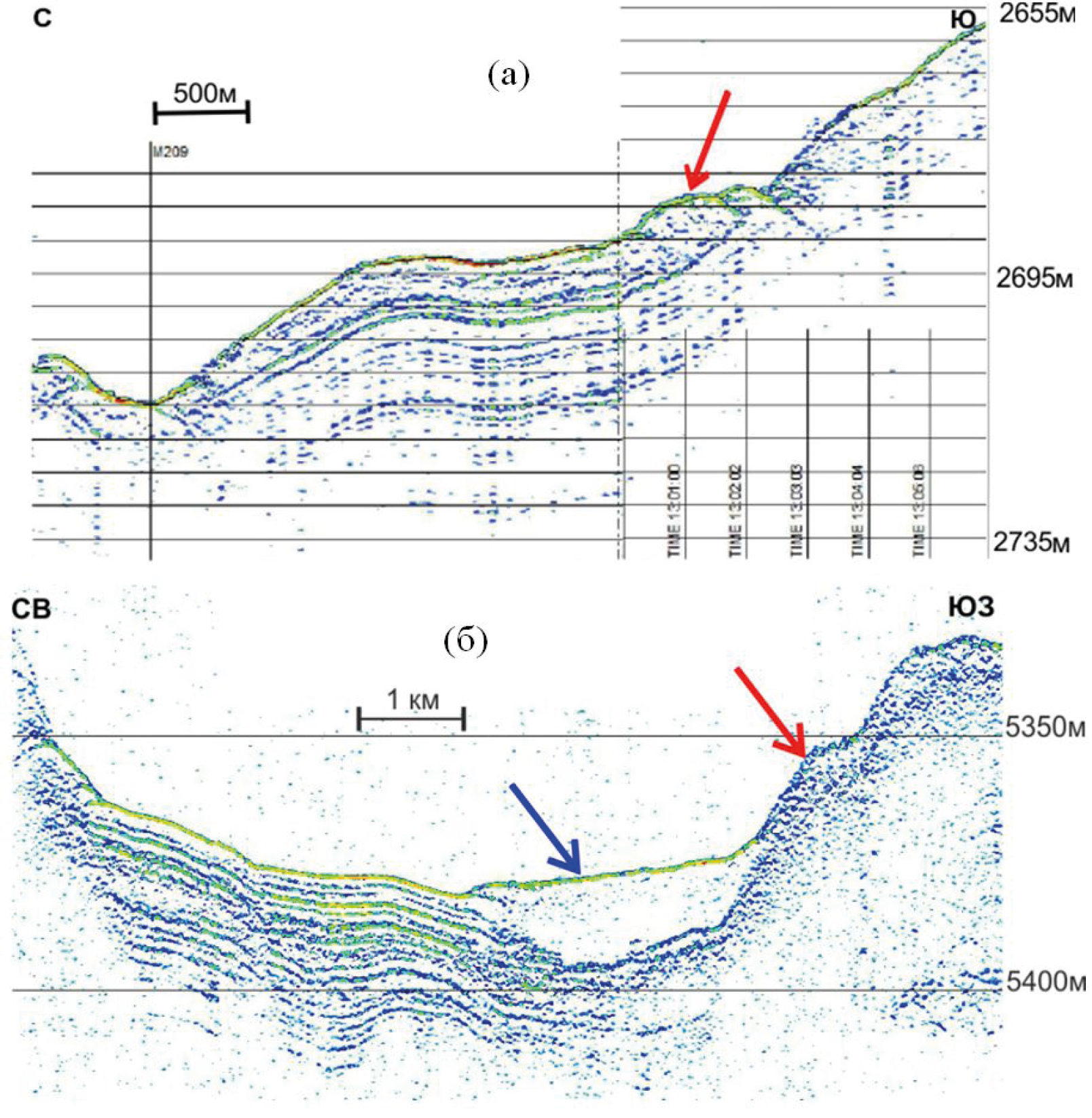 Рис. 3. Гравитационные отложения. а) Оползневое тело (стрелка). Признаки – хаотическая запись, выпуклая вверх неровная кровля, выраженная поверхность скольжения. Участок 1 на рис. 1. б) Отложения плотностного потока (синяя стрелка). Признаки – акустически прозрачная запись, эрозионный характер подошвы. Красные стрелки – оползневые блоки на прилегающем склоне подводного хребта. Участок 4 на рис. 1.