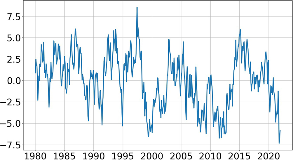 где  WMmonthyear– аномалия глобально осредненной температуры поверхности океана в месяц month года year. Из полученных данных выбираем поверхность Тихого океана к северу от 20° северной широты. В итоге имеем значения среднемесячных аномалий для каждого месяца с 1980 по 2021 г. Из них формируем столбцы матрицы X. И вычисляем первый ЭОФ – EOF.