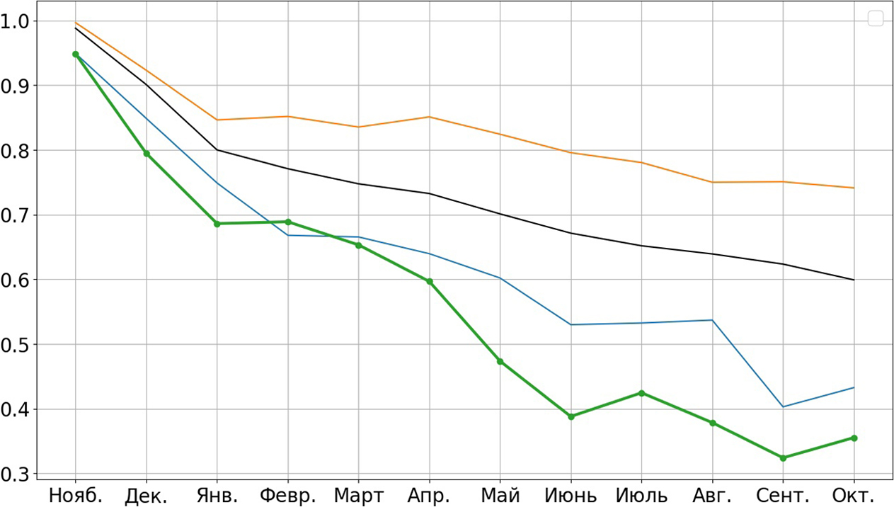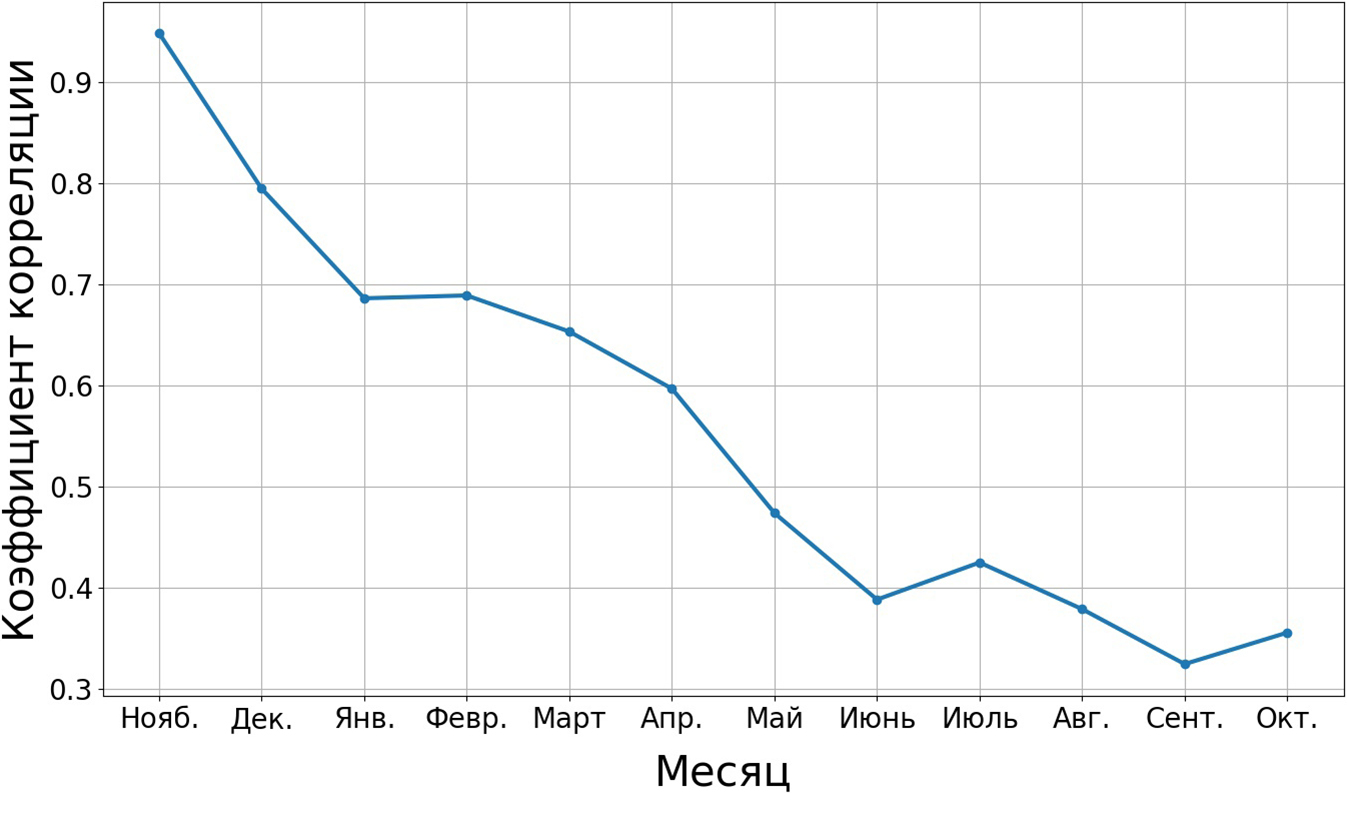 Рис. 3. График зависимости корреляции реального и спрогнозированного индексов ТДК в течение первого года прогноза.