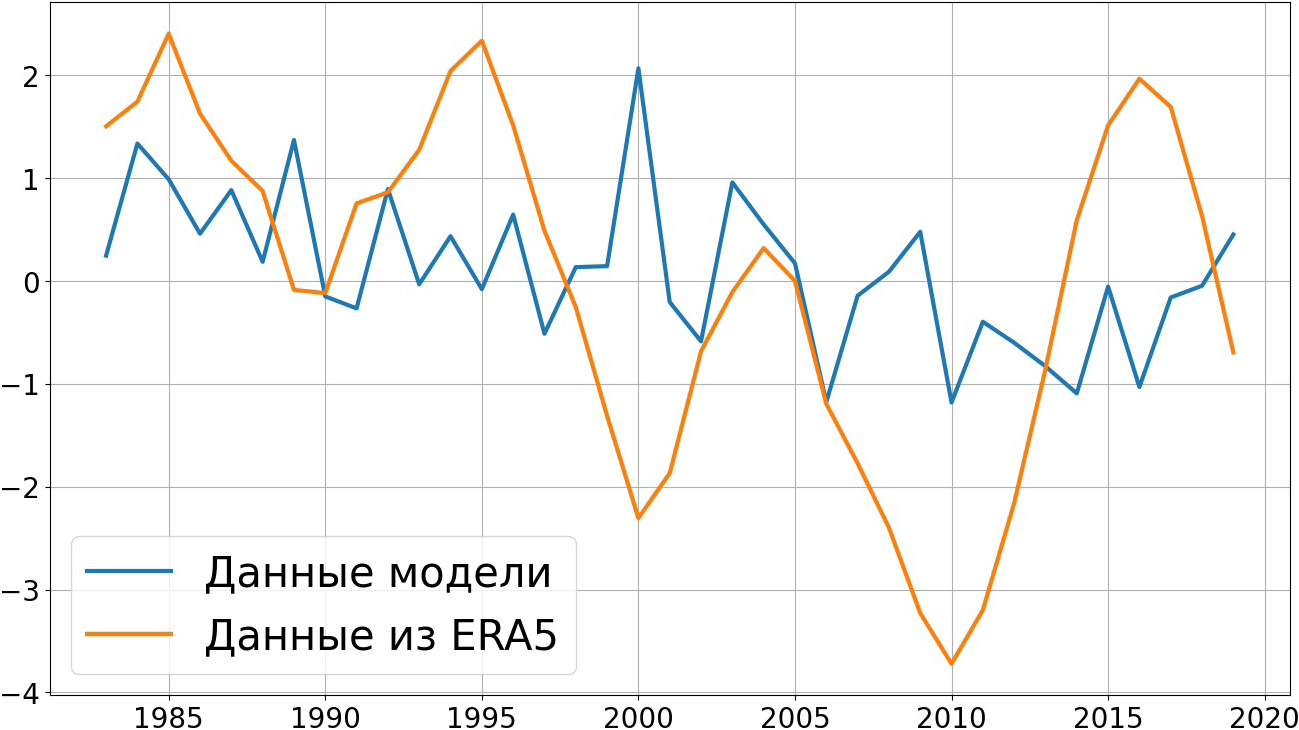 В качестве данных состояния климатической системы использовался реанализ атмосферы и поверхности суши ERA-Interim [11] для 1980–2018 гг., ERA5 (European Centre for Medium-Range Weather Forecasts Reanalysis) [7] для 2019–2021 гг. (данные реанализа ERA-Interim с августа 2019 года отсутствуют), а также реанализ океана и морского льда SODA3.4.2 (Simple Ocean Data Assimilation) [14] за 1980–2020 гг. При задании начальных условий учитывается что для разных периодов лет используются данные разных реанализов.